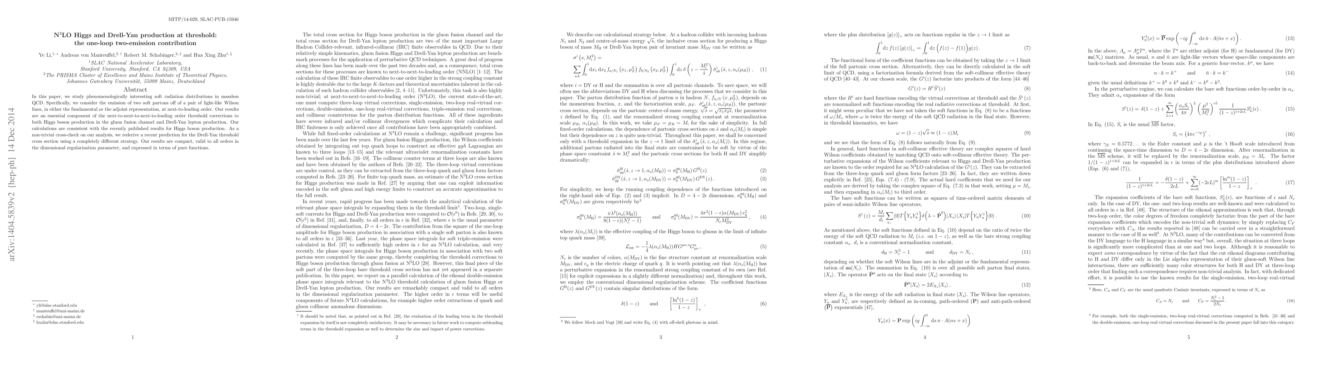 This paper investigates the one-loop two-emission contributions to N$^3$LO Higgs and Drell-Yan production at threshold in massless QCD, focusing on soft parton emissions from light-like Wilson lines. The findings provide crucial next-to-next-to-next-to-leading order corrections for both processes and are consistent with recent Higgs production results.