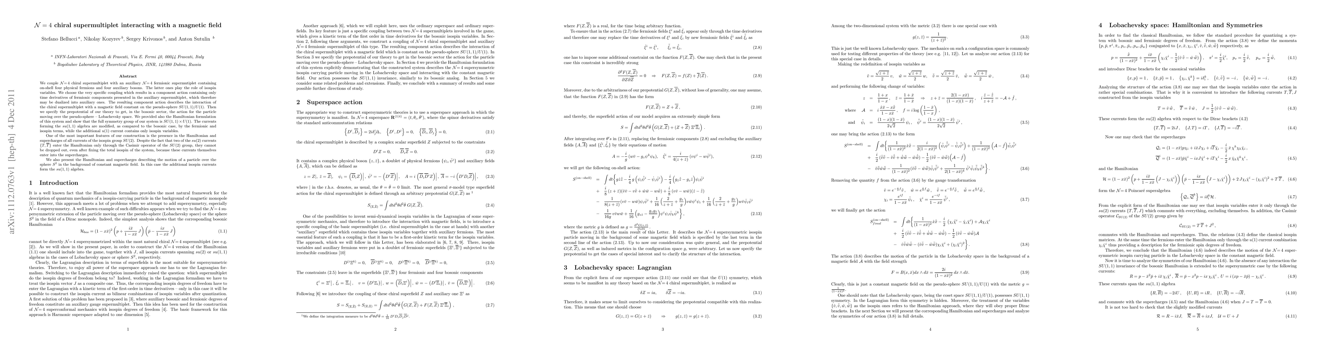 We couple N=4 chiral supermultiplet with an auxiliary N=4 fermionic supermutiplet containing on-shell four physical fermions and four auxiliary bosons. The latter ones play the role of isospin variables. We choose the very specific coupling which results in a component action containing only time derivatives of fermionic components presented in the auxiliary supermultiplet, which therefore may be dualized into auxiliary ones. The resulting component action describes the interaction of the chiral supermultiplet with a magnetic field constant on the pseudo-sphere $SU(1,1)/U(1)$. Then we specify the prepotential of our theory to get, in the bosonic sector, the action for the particle moving over the pseudo-sphere -- Lobachevsky space. We provided also the Hamiltonian formulation of this system and show that the full symmetry group of our system is $SU(1,1)\times U(1)$. The currents forming the $su(1,1)$ algebra are modified, as compared to the bosonic case, by the fermionic and isospin terms, while the additional u(1) current contains only isospin variables. One of the most important features of our construction is the presence in the Hamiltonian and supercharges of all currents of the isospin group SU(2). Despite the fact that two of the su(2) currents ${T,{\bar{T}}}$ enter the Hamiltonian only through the Casimir operator of the SU(2) group, they cannot be dropped out, even after fixing the total isospin of the system, because these currents themselves enter into the supercharges. We also present the Hamiltonian and supercharges describing the motion of a particle over the sphere $S^2$ in the background of constant magnetic field. In this case the additional isospin currents form the $su(1,1)$ algebra.