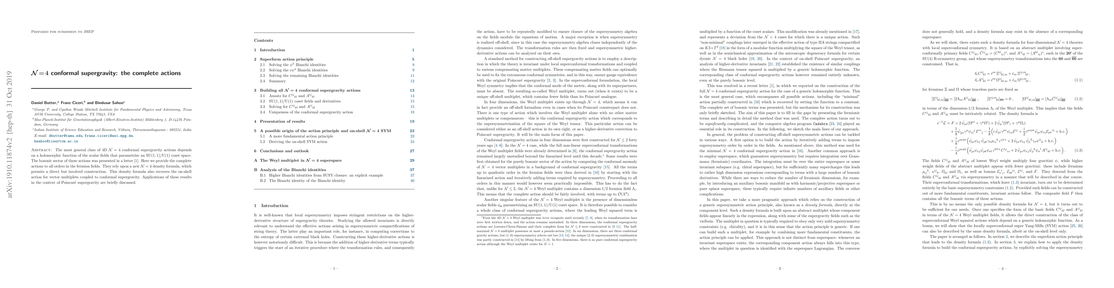This paper presents the complete actions for 4D N=4 conformal supergravity to all orders in fermionic fields, relying on a new N=4 density formula. The actions depend on a holomorphic function of scalar fields, and they recover the on-shell action for vector multiplets, with brief applications to Poincaré supergravity discussed.