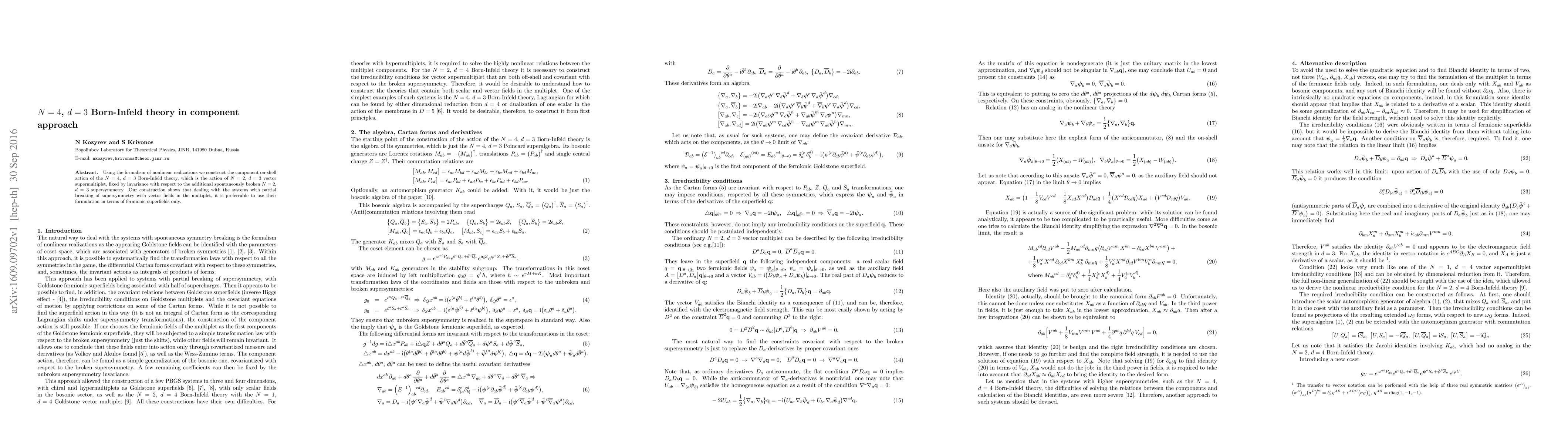 This paper constructs the on-shell action for N=4, d=3 Born-Infeld theory using nonlinear realizations, revealing that the theory is equivalent to an N=2, d=3 vector supermultiplet with spontaneously broken supersymmetry. The study emphasizes the effectiveness of using fermionic superfields for systems with partially broken supersymmetry involving vector fields.