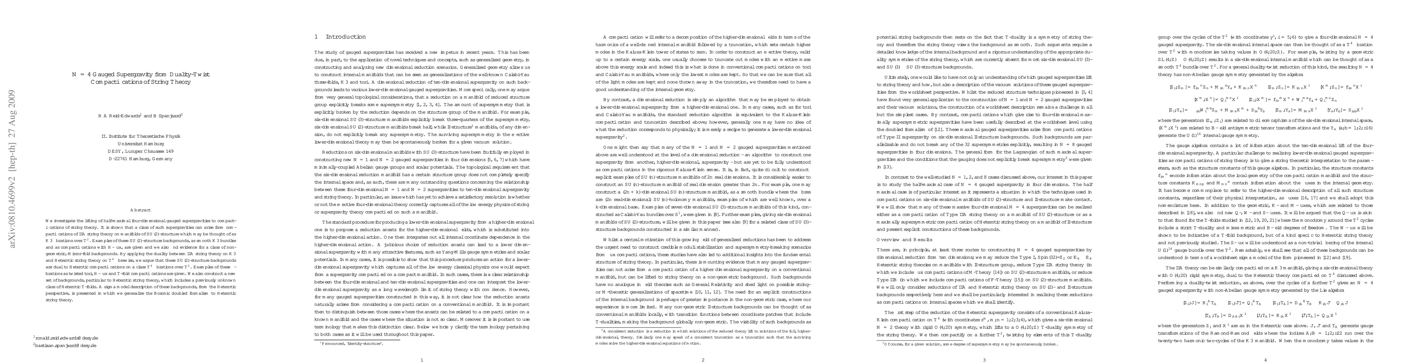 This paper explores how half-maximal four-dimensional gauged supergravities emerge from string theory compactifications, particularly on SU(2)-structure manifolds. It identifies these backgrounds as dual to specific Heterotic string theory compactifications, introducing new T-fold configurations and generalizing the Bosonic doubled formalism for Heterotic string theory.