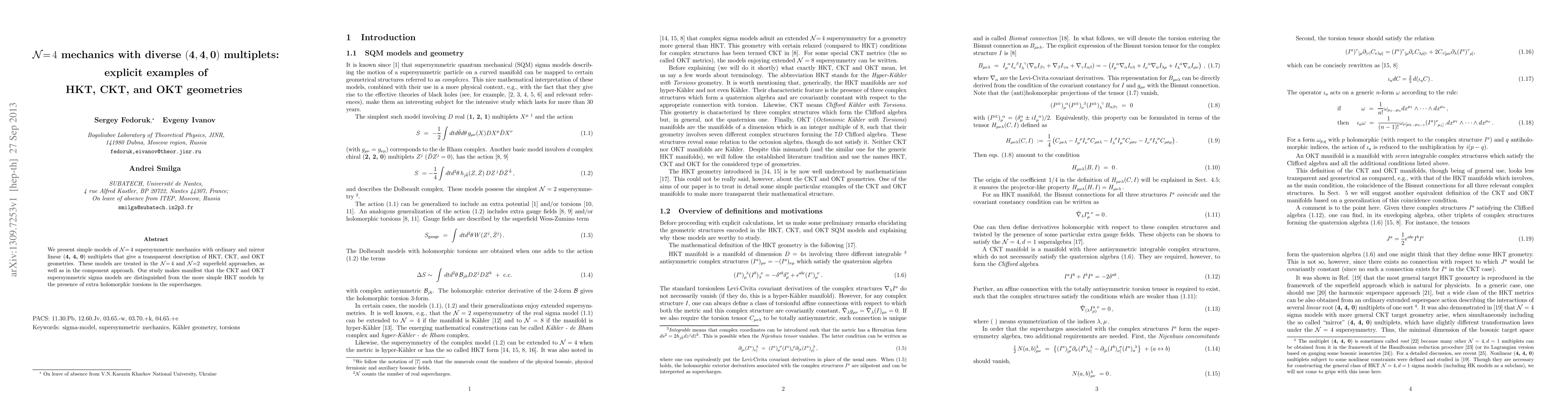The paper presents N=4 supersymmetric mechanics models with (4,4,0) multiplets, illustrating HKT, CKT, and OKT geometries. It highlights the distinction between CKT and OKT models from simpler HKT ones through extra holomorphic torsions in supercharges, using N=4, N=2 superfield, and component approaches.