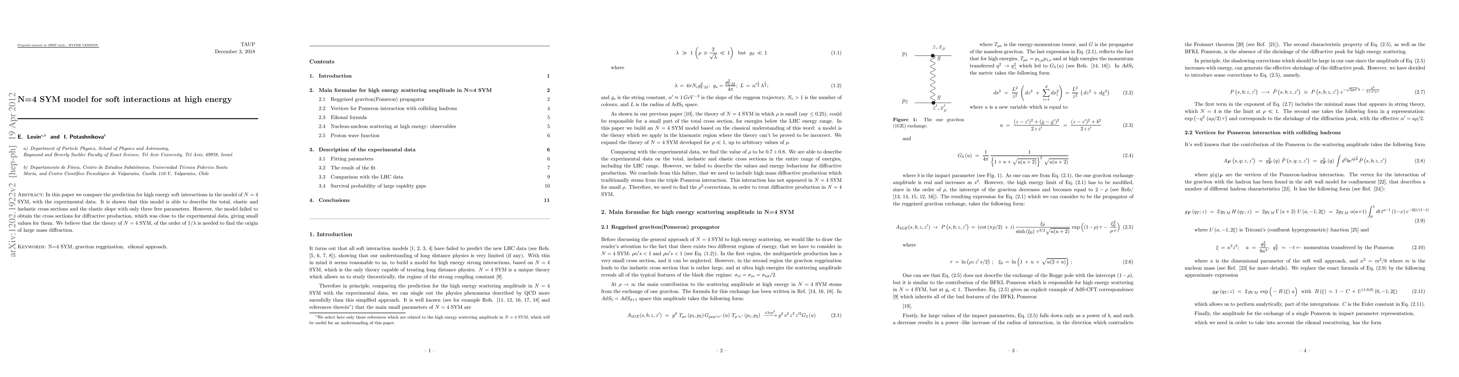 The paper presents a detailed comparison of N=4 SYM model predictions with experimental data for various cross sections and slopes, highlighting the model's strengths and weaknesses in describing high-energy soft interactions.