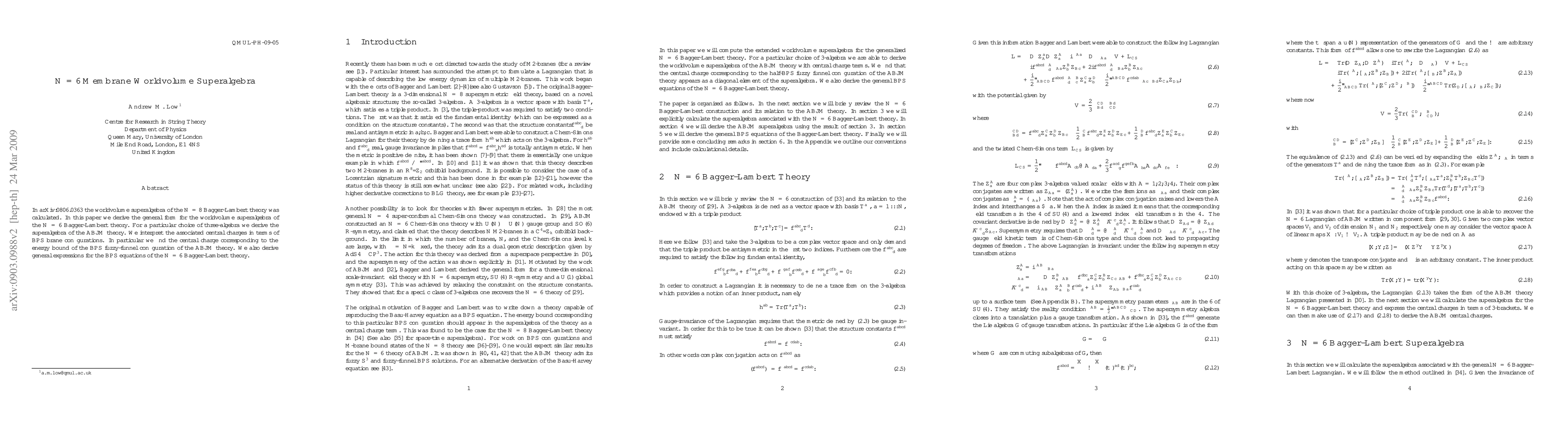 In arXiv:0806.0363 the worldvolume superalgebra of the $\mathcal{N}=8$ Bagger-Lambert theory was calculated. In this paper we derive the general form for the worldvolume superalgebra of the $\mathcal{N}=6$ Bagger-Lambert theory. For a particular choice of three-algebra we derive the superalgebra of the ABJM theory. We interpret the associated central charges in terms of BPS brane configurations. In particular we find the central charge corresponding to the energy bound of the BPS fuzzy-funnel configuration of the ABJM theory. We also derive general expressions for the BPS equations of the $\mathcal{N}=6$ Bagger-Lambert theory.