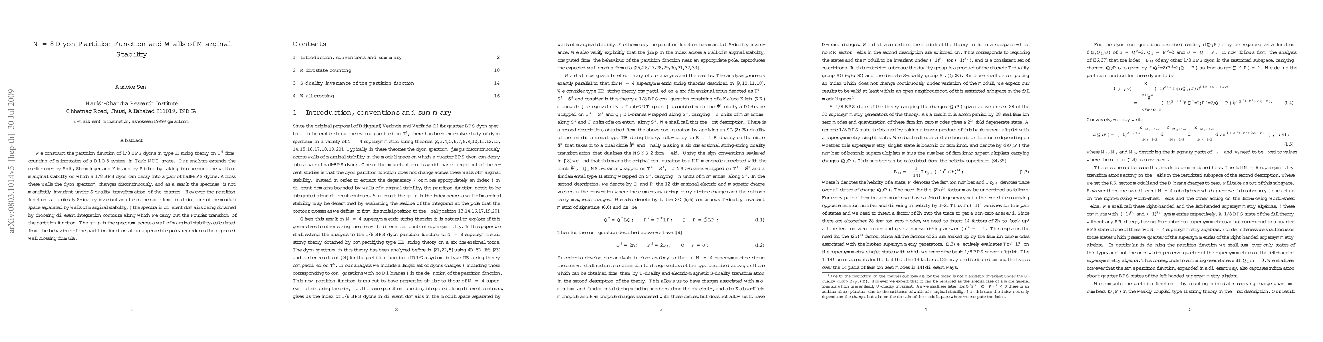 The paper constructs the partition function of 1/8 BPS dyons in string theory, incorporating walls of marginal stability where dyons decay into half-BPS pairs, and demonstrates S-duality invariance through integration contour adjustments. The partition function's behavior across these walls accurately predicts the expected wall crossing formula.