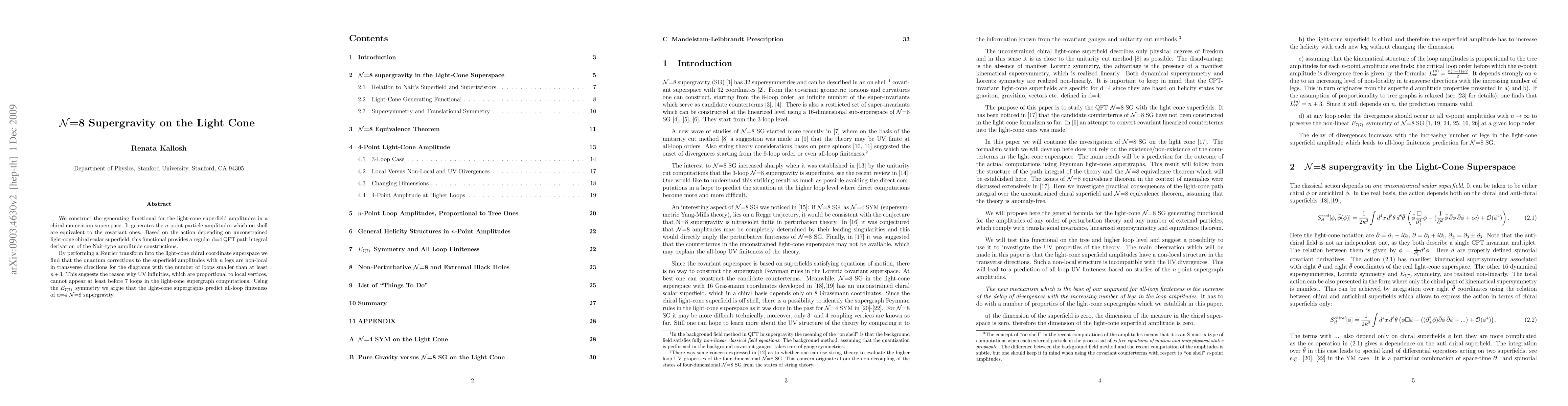 This paper constructs the generating functional for N=8 supergravity on the light cone, showing that quantum corrections are non-local in transverse directions for diagrams with fewer loops than expected. It argues for the all-loop finiteness of d=4 N=8 supergravity by combining E7 symmetry with supersymmetric recursion relations.