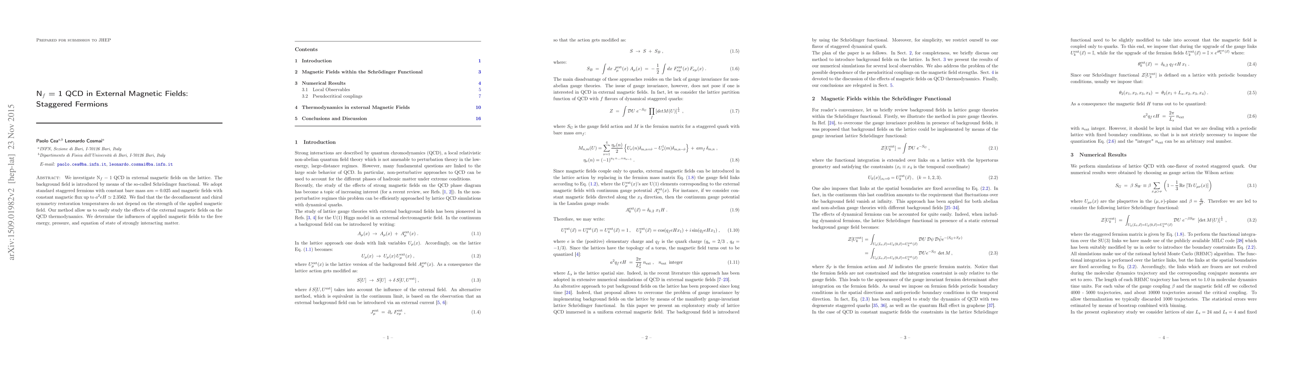 We investigate N$_f$ = 1 QCD in external magnetic fields on the lattice. The background field is introduced by means of the so-called Schrodinger functional. We adopt standard staggered fermions with constant bare mass $am = 0.025$ and magnetic fields with constant magnetic flux up to $a^2 e H \simeq 2.3562$. We find that the the deconfinement and chiral symmetry restoration temperatures do not depend on the strength of the applied magnetic field. Our method allow us to easily study the effects of the external magnetic fields on the QCD thermodynamics. We determine the influences of applied magnetic fields to the free energy, pressure, and equation of state of strongly interacting matter.