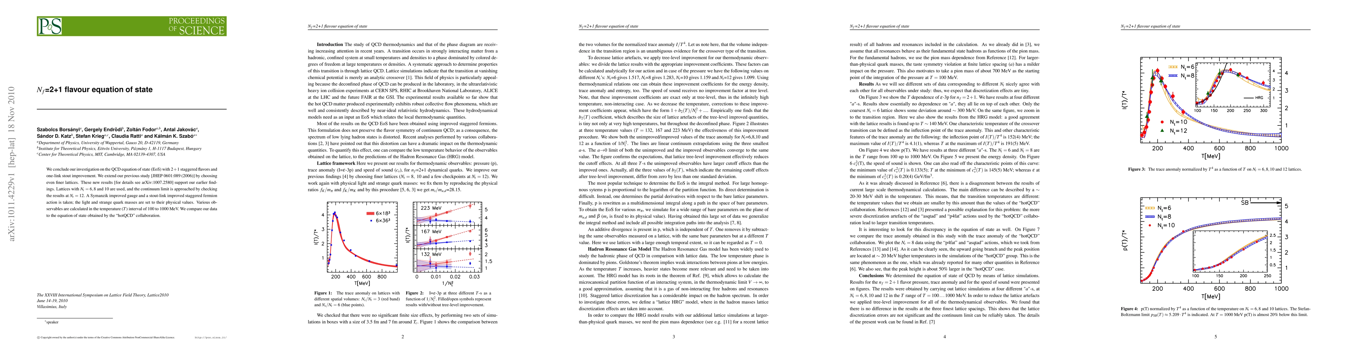 We conclude our investigation on the QCD equation of state (EoS) with 2+1 staggered flavors and one-link stout improvement. We extend our previous study [JHEP 0601:089 (2006)] by choosing even finer lattices. These new results [for details see arXiv:1007.2580] support our earlier findings. Lattices with N_t=6,8 and 10 are used, and the continuum limit is approached by checking the results at N_t=12. A Symanzik improved gauge and a stout-link improved staggered fermion action is taken; the light and strange quark masses are set to their physical values. Various observables are calculated in the temperature (T) interval of 100 to 1000~MeV. We compare our data to the equation of state obtained by the "hotQCD" collaboration.