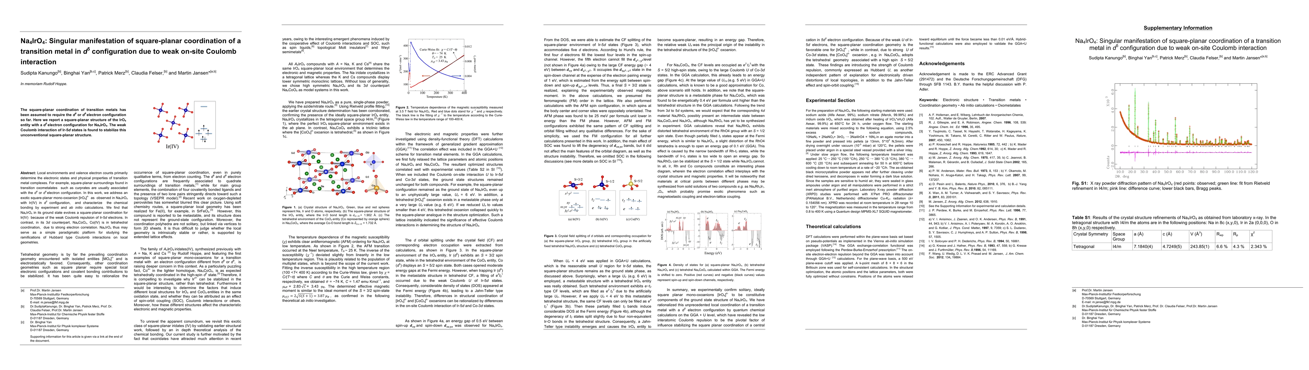 Local environments and valence electron counts primarily determine the electronic states and physical properties of transition metal complexes. For example, square-planar surroundings found in transition oxometalates such as curprates are usually associated with the d8 or d9 electron configuration. In this work, we address an exotic square-planar mono-oxoanion [IrO4]^{4-} as observed in Na4IrO4 with Ir(IV) in d^5 configuration, and characterize the chemical bonding by experiment and ab initio calculations. We find that Na4IrO4 in its ground state evolves a square-planar coordination for Ir(IV) because of the weak Coulomb repulsion of Ir-5d electrons. In contrast, in its 3d counterpart, Na4CoO4, Co(IV) is in tetrahedral coordination, due to strong electron correlation. Na4IrO4 thus may serve as a simple paradigmatic platform for studying the ramifications of Hubbard type Coulomb interactions on local geometries.