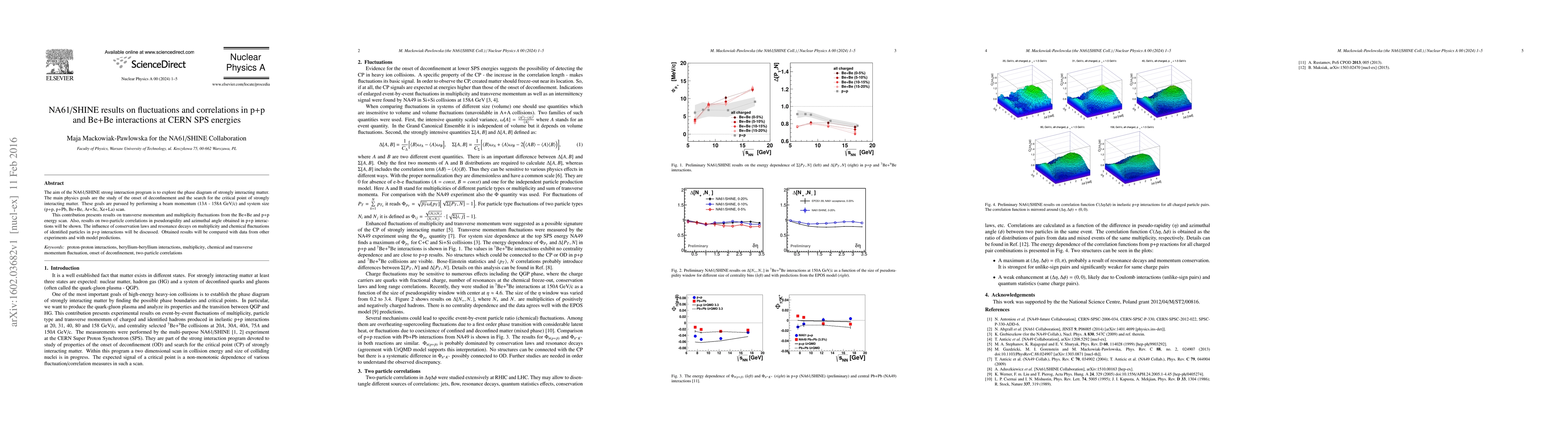 The NA61/SHINE experiment investigates the phase diagram of strongly interacting matter, focusing on fluctuations and correlations in p+p and Be+Be interactions at CERN SPS energies. Results include transverse momentum and multiplicity fluctuations, two-particle correlations, and the influence of conservation laws, with comparisons to other experiments and models.