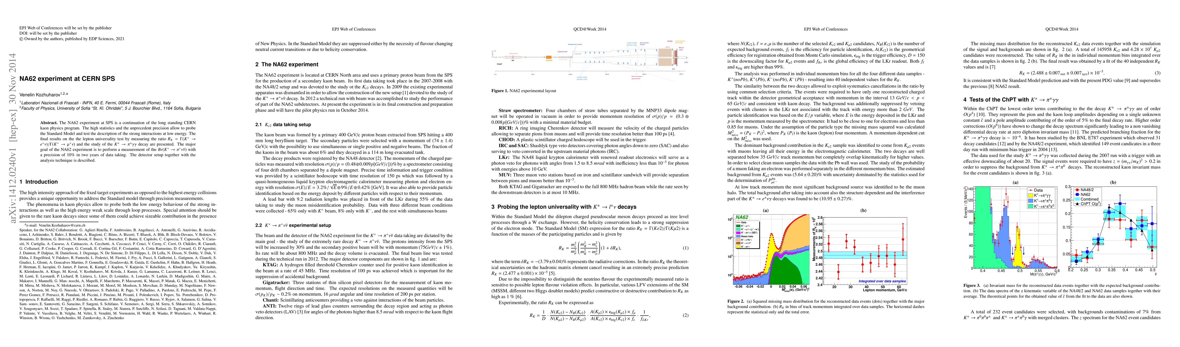 The NA62 experiment at SPS is a continuation of the long standing CERN kaon physics program. The high statistics and the unprecedent precision allow to probe the Standard Model and test the description of the strong interactions at low energy. The final results on the the lepton universality test by measuring the ratio $R_K = \Gamma(K^{+}\to e^{+}\nu) / \Gamma(K^{+}\to \mu^{+}\nu)$ and the study of the $K^\pm\to\pi^{\pm}\gamma\gamma $ decay are presented. The major goal of the NA62 experiment is to perform a measurement of the $Br(K^{+} \to \pi^{+} \nu \bar{\nu})$ with a precision of 10% in two years of data taking. The detector setup together with the analysis technique is described.