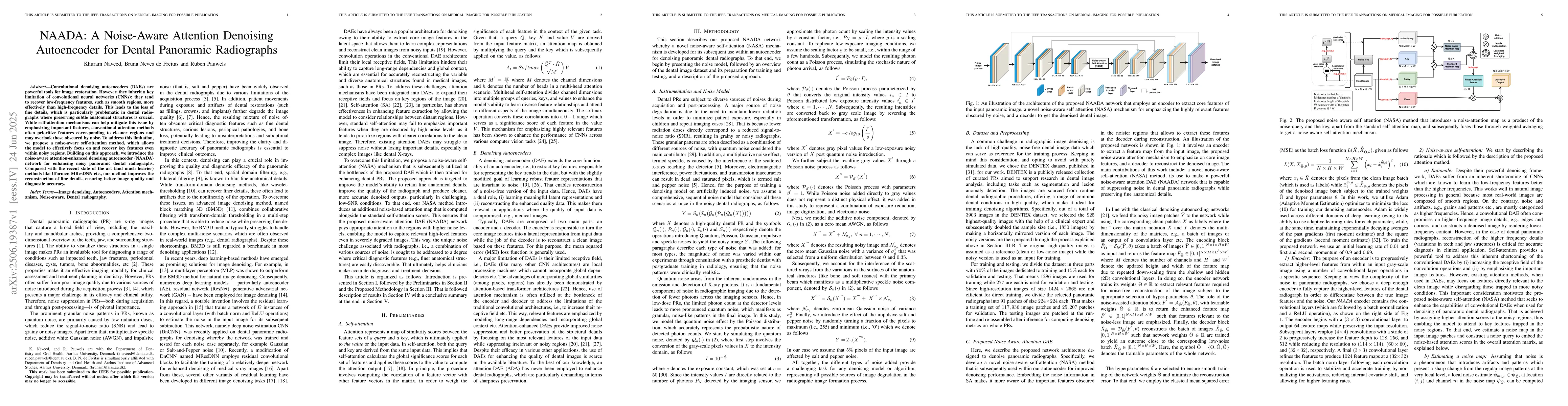 The paper proposes NAADA, a Noise-Aware Attention Denoising Autoencoder for dental panoramic radiographs, which incorporates a novel noise-aware self-attention mechanism to enhance feature recovery, especially in noisy regions. The method is evaluated using the DENTEX dataset, comparing it with existing state-of-the-art methods like Uformer, MResDNN, and others.