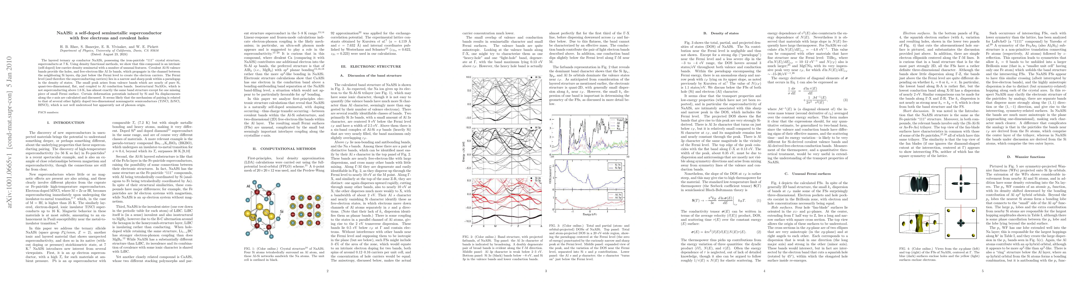 The layered ternary sp conductor NaAlSi, possessing the iron-pnictide "111" crystal structure, superconducts at 7 K. Using density functional methods, we show that this compound is an intrinsic (self-doped) low-carrier-density semimetal with a number of unusual features. Covalent Al-Si valence bands provide the holes, and free-electron-like Al 3s bands, which propagate in the channel between the neighboring Si layers, dip just below the Fermi level to create the electron carriers. The Fermi level (and therefore the superconducting carriers) lies in a narrow and sharp peak within a pseudogap in the density of states. The small peak arises from valence bands which are nearly of pure Si, quasi-two-dimensional, flat, and coupled to Al conduction bands. Isostructural NaAlGe, which is not superconducting above 1.6 K, has almost exactly the same band structure except for one missing piece of small Fermi surface. Certain deformation potentials induced by Si and Na displacements along the c-axis are calculated and discussed. It seems likely that the mechanism of pairing is related to that of several other lightly doped two-dimensional nonmagnetic semiconductors (TiNCl, ZrNCl, HfNCl), which is not well understood but apparently not of phonon origin.
