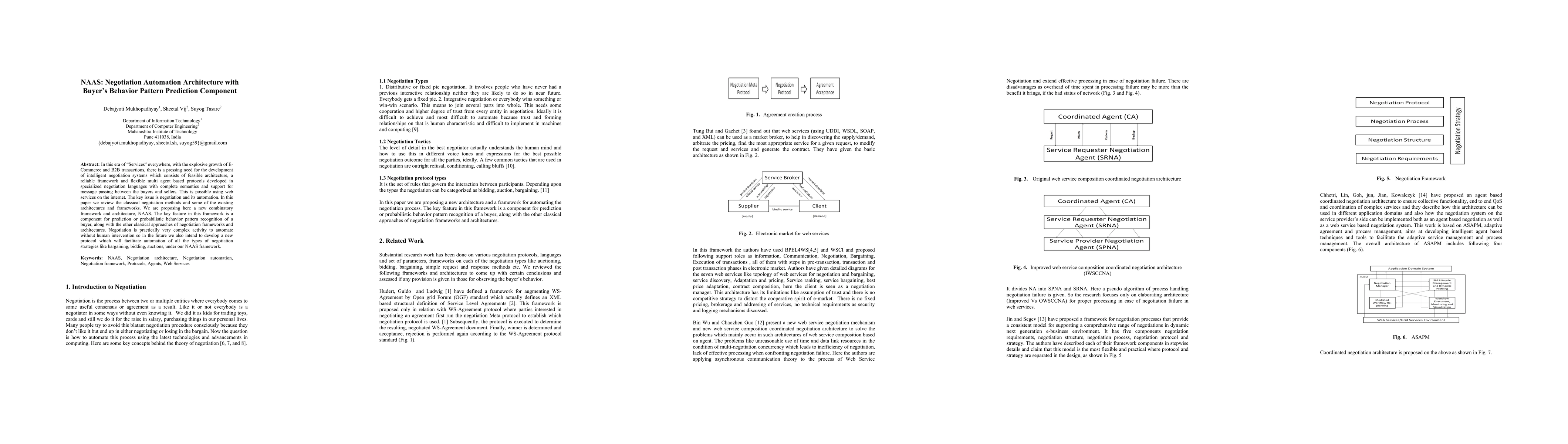 In this era of "Services" everywhere, with the explosive growth of E-Commerce and B2B transactions, there is a pressing need for the development of intelligent negotiation systems which consists of feasible architecture, a reliable framework and flexible multi agent based protocols developed in specialized negotiation languages with complete semantics and support for message passing between the buyers and sellers. This is possible using web services on the internet. The key issue is negotiation and its automation. In this paper we review the classical negotiation methods and some of the existing architectures and frameworks. We are proposing here a new combinatory framework and architecture, NAAS. The key feature in this framework is a component for prediction or probabilistic behavior pattern recognition of a buyer, along with the other classical approaches of negotiation frameworks and architectures. Negotiation is practically very complex activity to automate without human intervention so in the future we also intend to develop a new protocol which will facilitate automation of all the types of negotiation strategies like bargaining, bidding, auctions, under our NAAS framework.