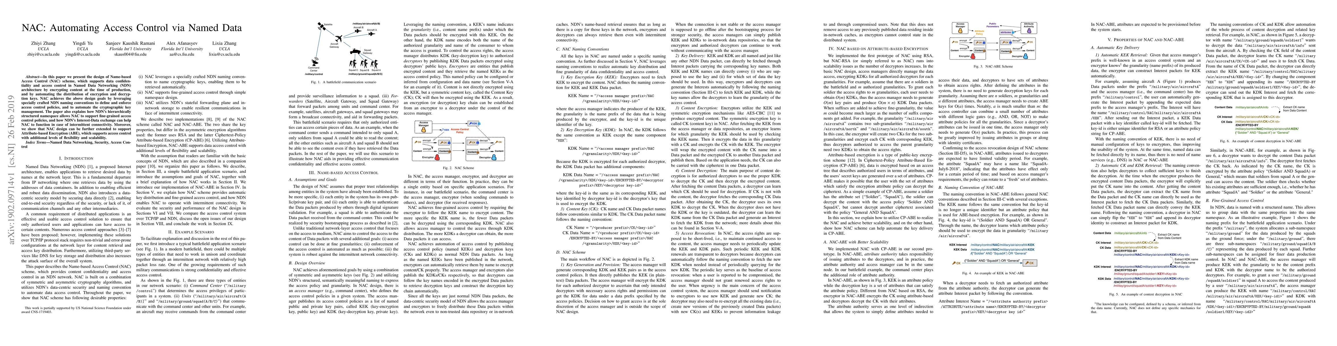 This paper introduces the Name-based Access Control (NAC) scheme for Named Data Networking, automating access control and key management through NDN's naming conventions, while supporting fine-grained policies and intermittent connectivity, and extending to Attribute-based Encryption for enhanced flexibility.