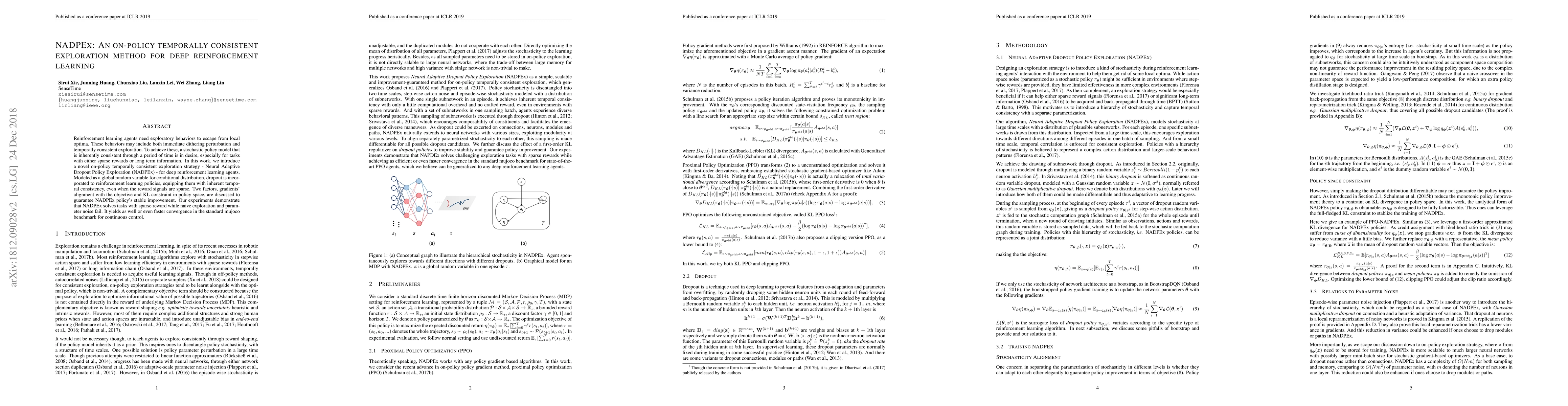 NADPEx introduces a novel on-policy exploration method that leverages adaptive dropout to provide temporal consistency, aiding deep reinforcement learning agents in escaping local optima, especially in sparse reward environments. Experiments show NADPEx achieves stable and faster convergence compared to traditional methods.