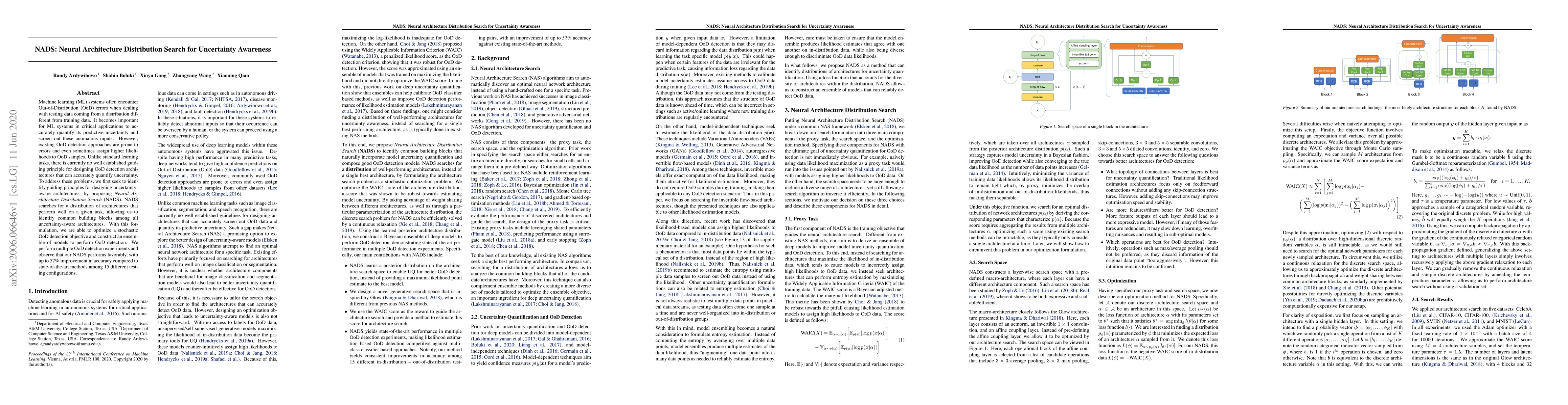 NADS proposes a Neural Architecture Distribution Search to identify guiding principles for designing uncertainty-aware architectures, optimizing a stochastic Out-of-Distribution detection objective, and achieving up to 57% improvement in accuracy over state-of-the-art methods.