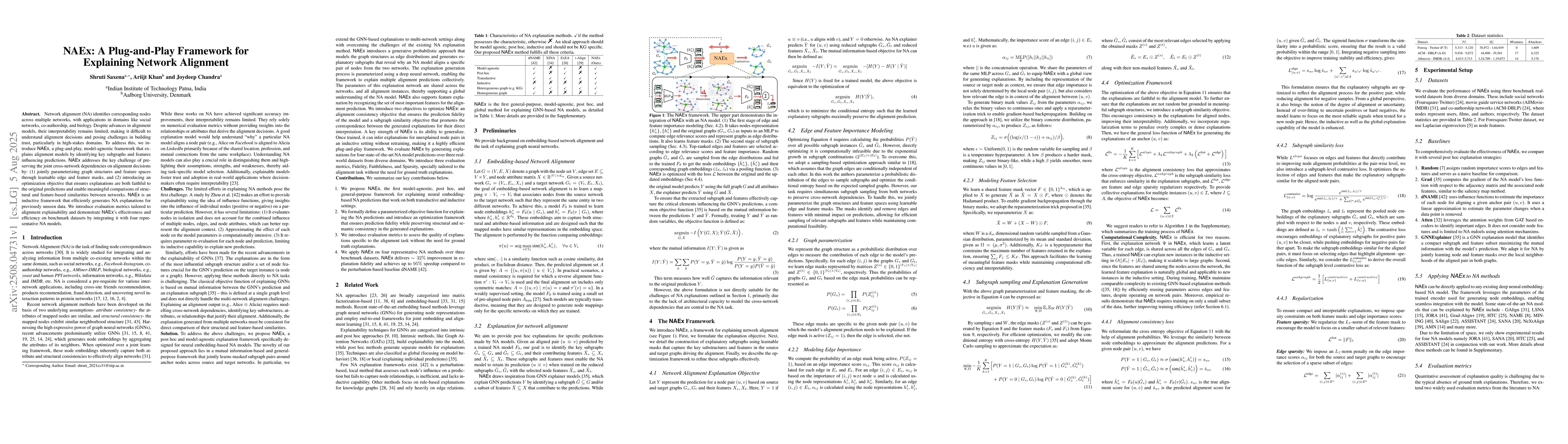 Network alignment (NA) identifies corresponding nodes across multiple networks, with applications in domains like social networks, co-authorship, and biology. Despite advances in alignment models, their interpretability remains limited, making it difficult to understand alignment decisions and posing challenges in building trust, particularly in high-stakes domains. To address this, we introduce NAEx, a plug-and-play, model-agnostic framework that explains alignment models by identifying key subgraphs and features influencing predictions. NAEx addresses the key challenge of preserving the joint cross-network dependencies on alignment decisions by: (1) jointly parameterizing graph structures and feature spaces through learnable edge and feature masks, and (2) introducing an optimization objective that ensures explanations are both faithful to the original predictions and enable meaningful comparisons of structural and feature-based similarities between networks. NAEx is an inductive framework that efficiently generates NA explanations for previously unseen data. We introduce evaluation metrics tailored to alignment explainability and demonstrate NAEx's effectiveness and efficiency on benchmark datasets by integrating it with four representative NA models.