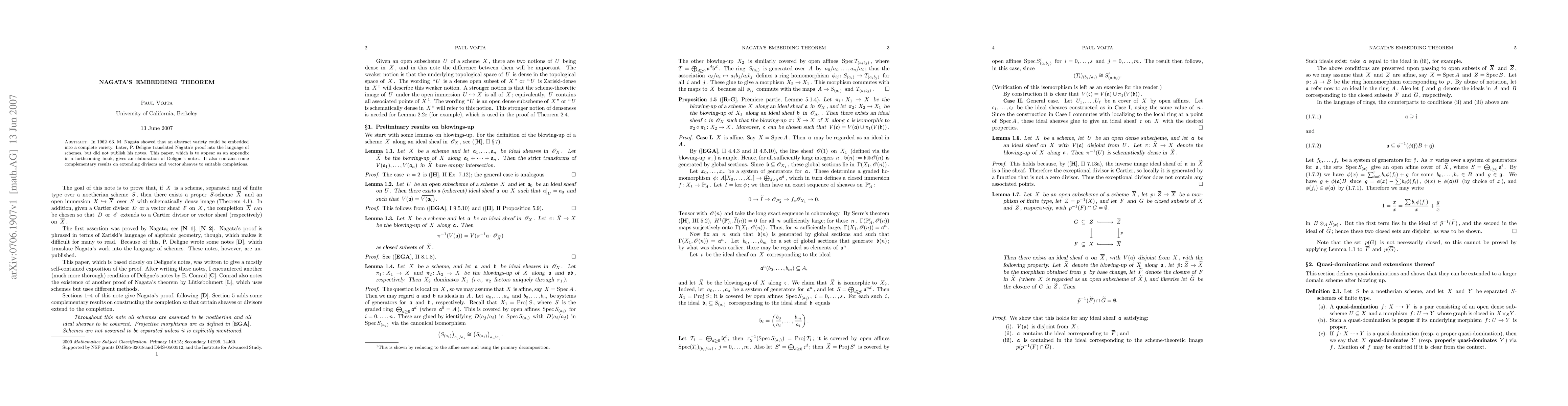 In 1962-63, M. Nagata showed that an abstract variety could be embedded into a complete variety. Later, P. Deligne translated Nagata's proof into the language of schemes, but did not publish his notes. This paper, which is to appear as an appendix in a forthcoming book, gives an elaboration of Deligne's notes. It also contains some complementary results on extending divisors and vector sheaves to suitable completions.