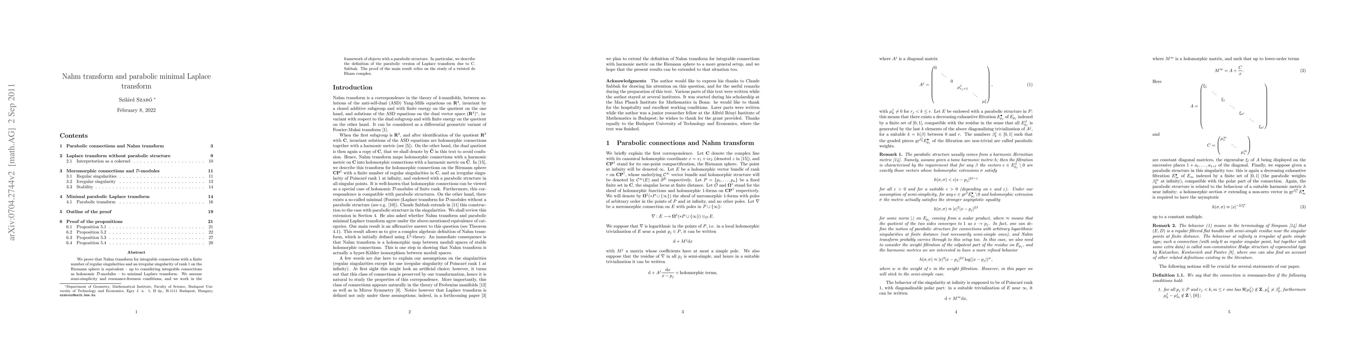 This paper establishes the equivalence between the Nahm transform for integrable connections and the minimal Laplace transform, under semi-simplicity and resonance-freeness conditions, within the context of objects with parabolic structures. The proof leverages a twisted de Rham complex.
