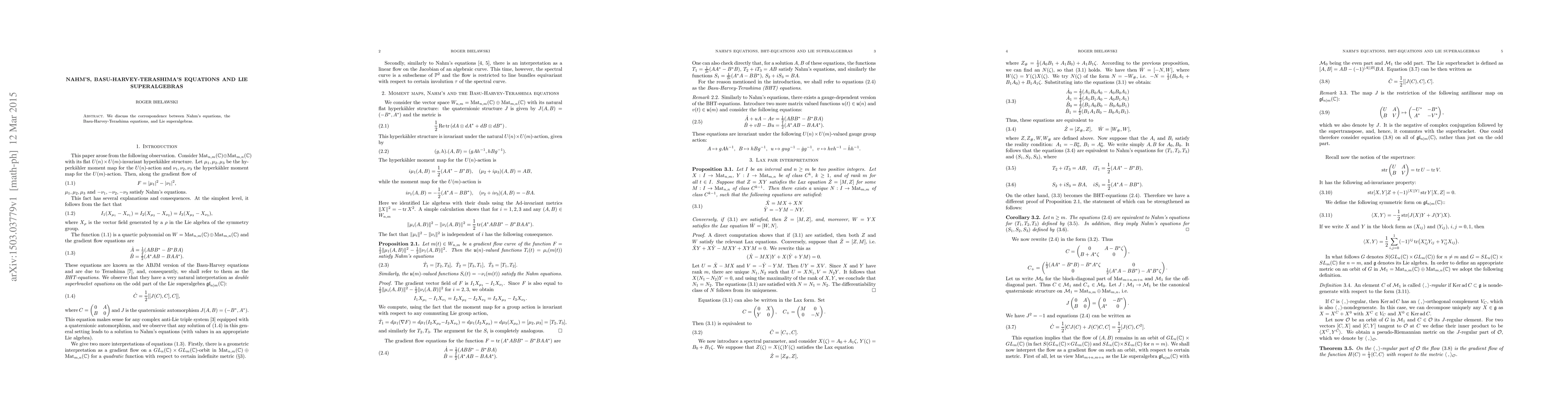 Summary: This paper explores the relationship between Nahm's equations, Basu-Harvey-Terashima equations, and Lie superalgebras, highlighting their underlying mathematical structures and interconnections.