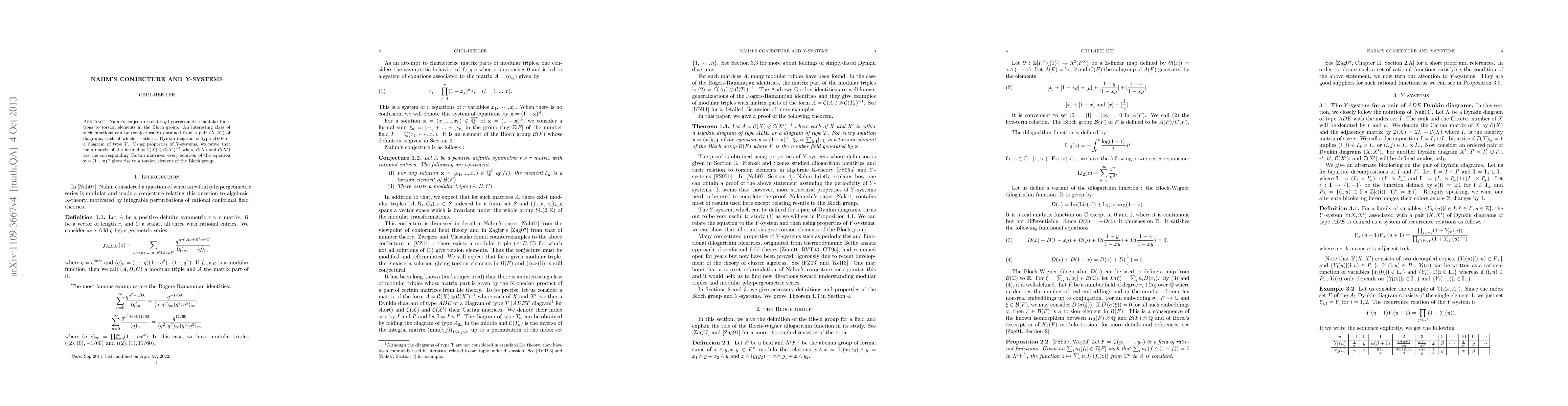Nahm's conjecture relates $q$-hypergeometric modular functions to torsion elements in the Bloch group. An interesting class of such functions can be (conjecturally) obtained from a pair $(X,X')$ of diagrams, each of which is either a Dynkin diagram of type $ADE$ or a diagram of type $T$. Using properties of Y-systems, we prove that for a matrix of the form $A=\mathcal{C}(X)\otimes \mathcal{C}(X')^{-1}$ where $\mathcal{C}(X)$ and $\mathcal{C}(X')$ are the corresponding Cartan matrices, every solution of the equation $\mathbf{x}=(1-\mathbf{x})^A$ gives rise to a torsion element of the Bloch group.