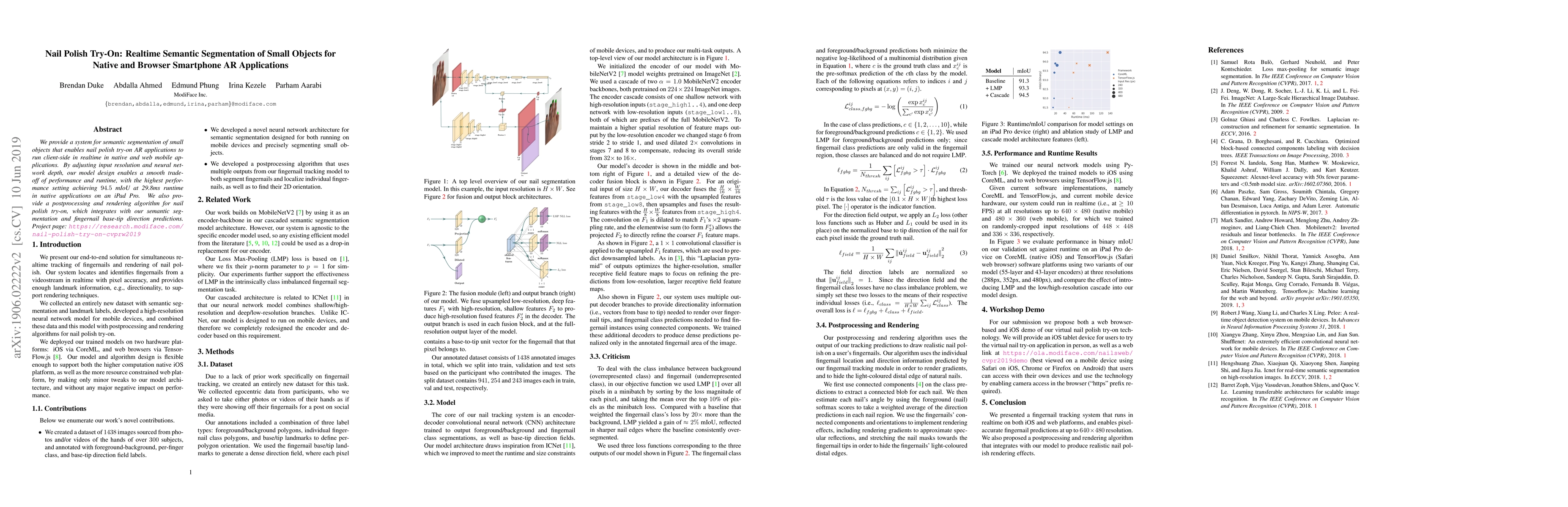 This paper presents a realtime semantic segmentation system for small objects, enabling nail polish try-on AR applications to run client-side in both native and web mobile apps. The model achieves a high performance of 94.5% mIoU at 29.8ms runtime, with adaptable input resolution and neural network depth for optimal trade-offs.