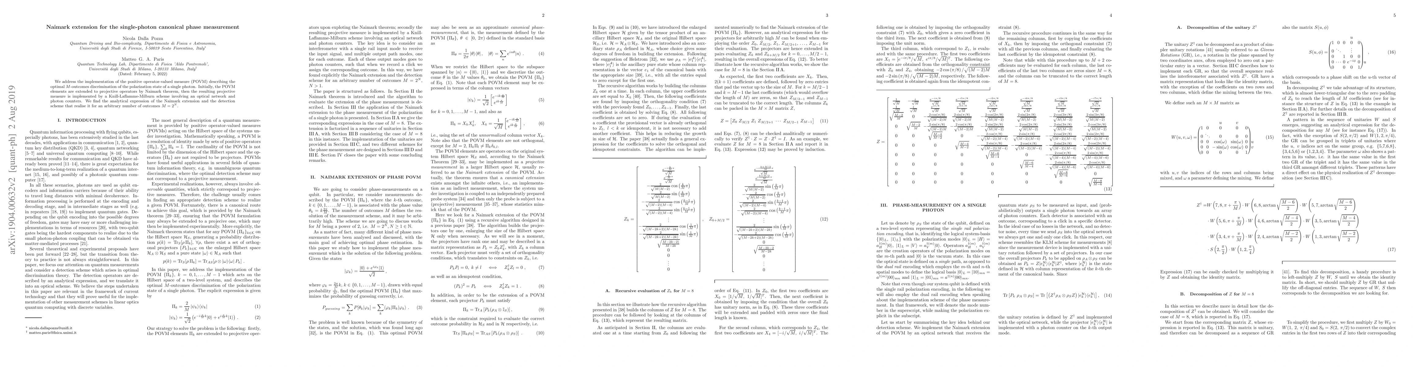 This paper presents the implementation of a positive operator-valued measure (POVM) for the optimal discrimination of a single photon's polarization state, extending the POVM to projective operators via the Naimark theorem, and realizing it through a Knill-Laflamme-Milburn scheme with optical networks and photon counters. The analytical expression for the Naimark extension and the detection scheme is derived for any number of outcomes M = 2^N.