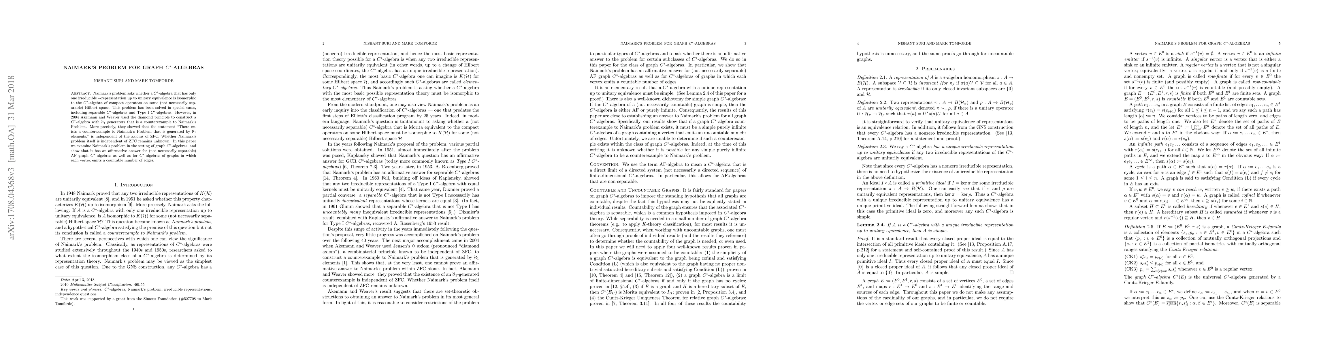 Naimark's problem asks whether a C*-algebra that has only one irreducible *-representation up to unitary equivalence is isomorphic to the C*-algebra of compact operators on some (not necessarily separable) Hilbert space. This problem has been solved in special cases, including separable C*-algebras and Type I C*-algebras. However, in 2004 Akemann and Weaver used the diamond principle to construct a C*-algebra with $\aleph_1$ generators that is a counterexample to Naimark's Problem. More precisely, they showed that the statement "There exists a counterexample to Naimark's Problem that is generated by $\aleph_1$ elements." is independent of the axioms of ZFC. Whether Naimark's problem itself is independent of ZFC remains unknown. In this paper we examine Naimark's problem in the setting of graph C*-algebras, and show that it has an affirmative answer for (not necessarily separable) AF graph C*-algebras as well as for C*-algebras of graphs in which each vertex emits a countable number of edges.