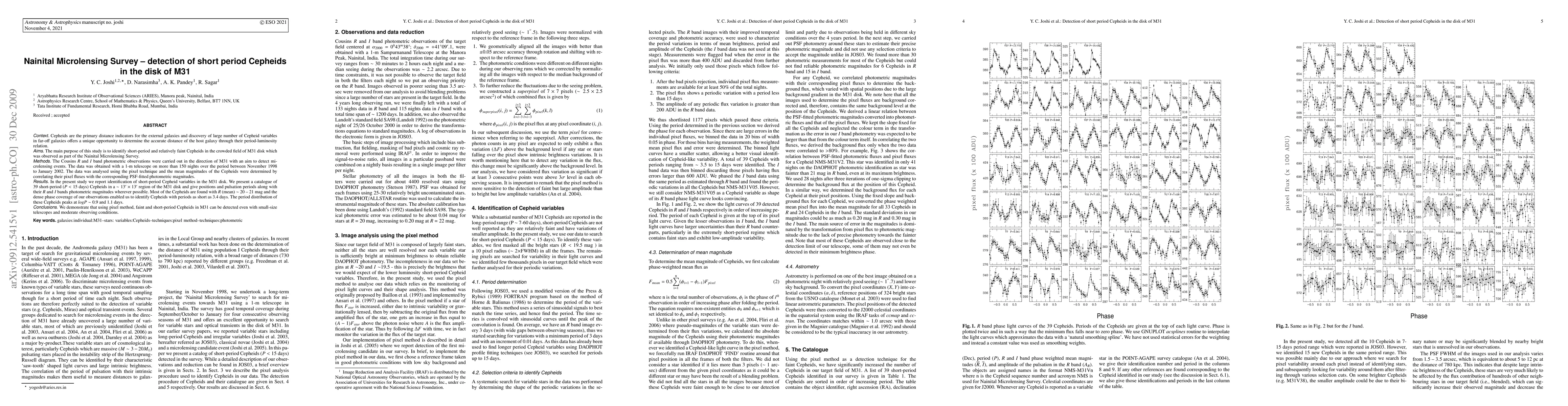 The discovery of large number of Cepheid variables in far-off galaxies offers a unique opportunity to determine the accurate distance of the host galaxy through their period-luminosity relation. The main aim of the present study is to identify short-period and relatively faint Cepheids in the crowded field of M31 disk which was observed as part of the Nainital Microlensing Survey. The Cousins R and I-band photometric observations were obtained with a 1-m telescope on more than 150 nights over the period between November 1998 to January 2002. The data was analysed using the pixel technique and the mean magnitudes of the Cepheids were determined by correlating their pixel fluxes with the corresponding PSF-fitted photometric magnitudes. Here, we report identification of 39 short-period Cepheid variables in the M31 disk. Most of the Cepheids are found with R (mean) ~ 20-21 mag and the dense phase coverage of our observations enabled us to identify Cepheids with periods as short as 3.4 days The frequency-period distribution of these Cepheids peaks at logP ~ 0.9 and 1.1 days.