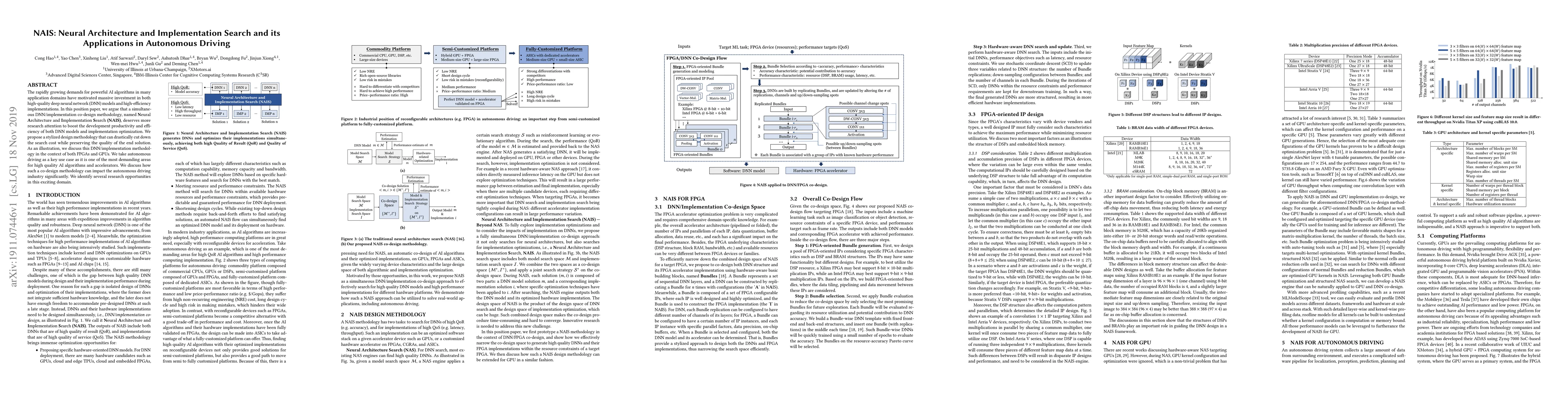 This paper proposes Neural Architecture and Implementation Search (NAIS), a co-design methodology for optimizing both deep neural network architectures and their implementations. The authors argue that this approach can significantly enhance development efficiency and productivity, particularly in resource-intensive fields like autonomous driving, by reducing search costs while maintaining solution quality.