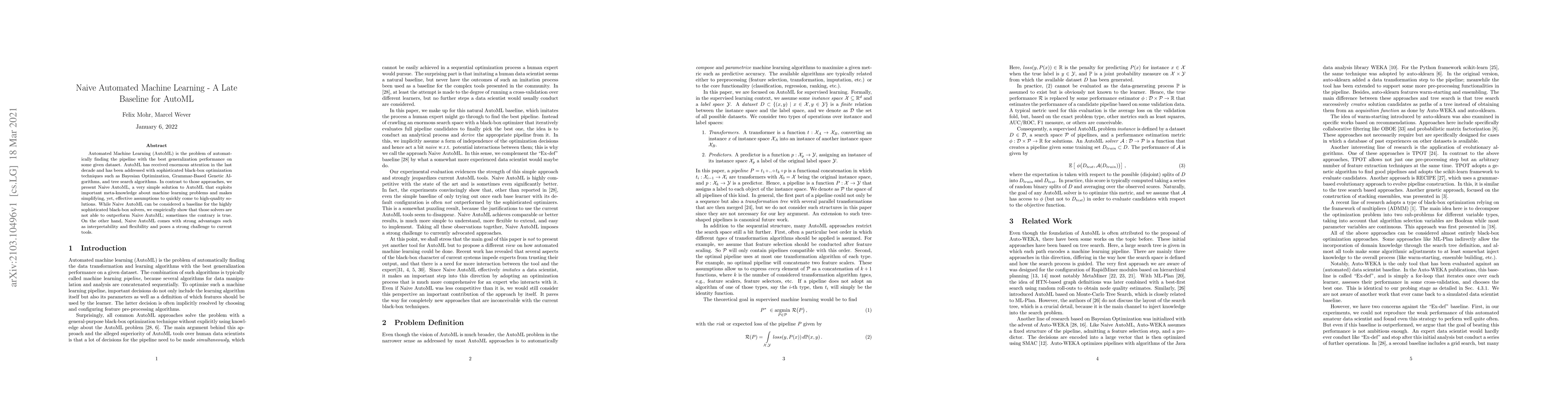 Summary: This paper introduces Naive AutoML, a straightforward yet effective approach to Automated Machine Learning that leverages meta-knowledge and simplifying assumptions. Despite its simplicity, it often outperforms sophisticated black-box optimization techniques, highlighting its interpretability and flexibility as strong advantages.