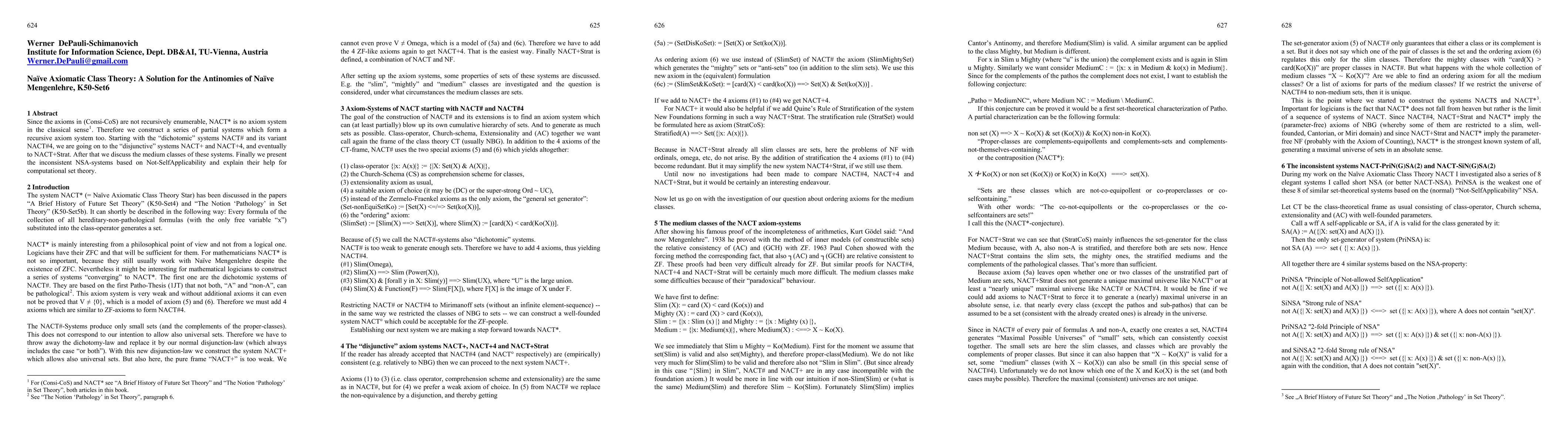 Since the axioms in (Consi-CoS) are not recursively enumerable, NACT* is no axiom system in the classical sense . Therefore we construct a series of partial systems which form a recursive axiom system too. Starting with the "dichotomic" systems NACT# and its variant NACT#4, we are going on to the "disjunctive" systems NACT+ and NACT+4, and eventually to NACT+Strat. After that we discuss the medium classes of these systems. Finally we present the inconsistent NSA-systems based on Not-SelfApplicability and explain their help for computational set theory.