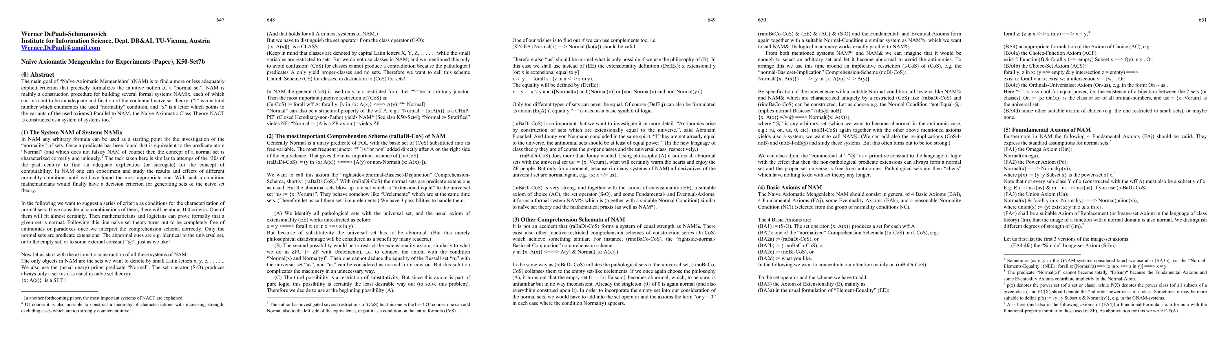 The main goal of "Naive Axiomatic Mengenlehre" (NAM) is to find a more or less adequately explicit criterion that precisely formalizes the intuitive notion of a "normal set". NAM is mainly a construction procedure for building several formal systems NAMix, each of which can turn out to be an adequate codification of the contentual naive set theory. ("i" is a natural number which enumerates the used "normality" condition, and "x" is a letter which points to the variants of the used axioms.) Parallel to NAM, the Naive Axiomatic Class Theory NACT is constructed as a system of systems too.