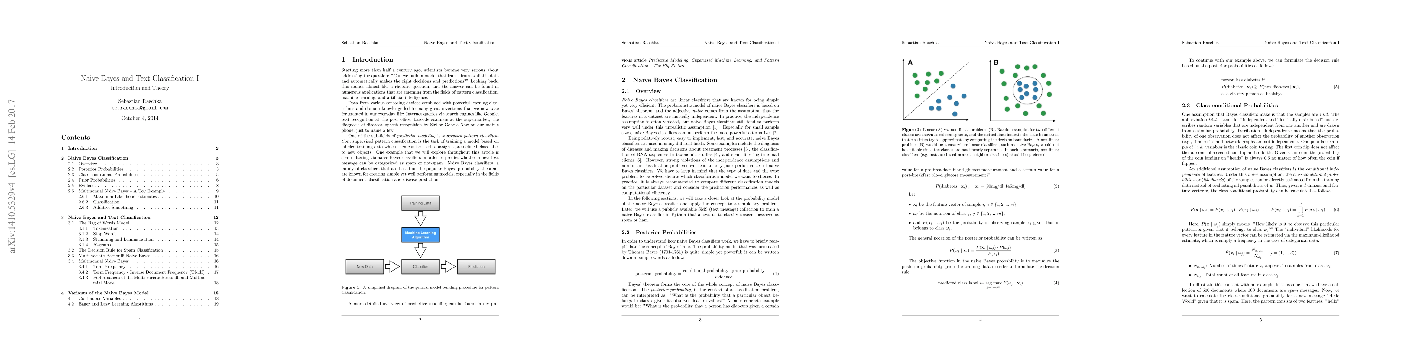 Summary: This paper introduces naive Bayes classifiers, which leverage Bayes' theorem to build simple yet effective models, particularly for document classification. It outlines the fundamental concepts and theoretical underpinnings of naive Bayes in the context of text categorization.