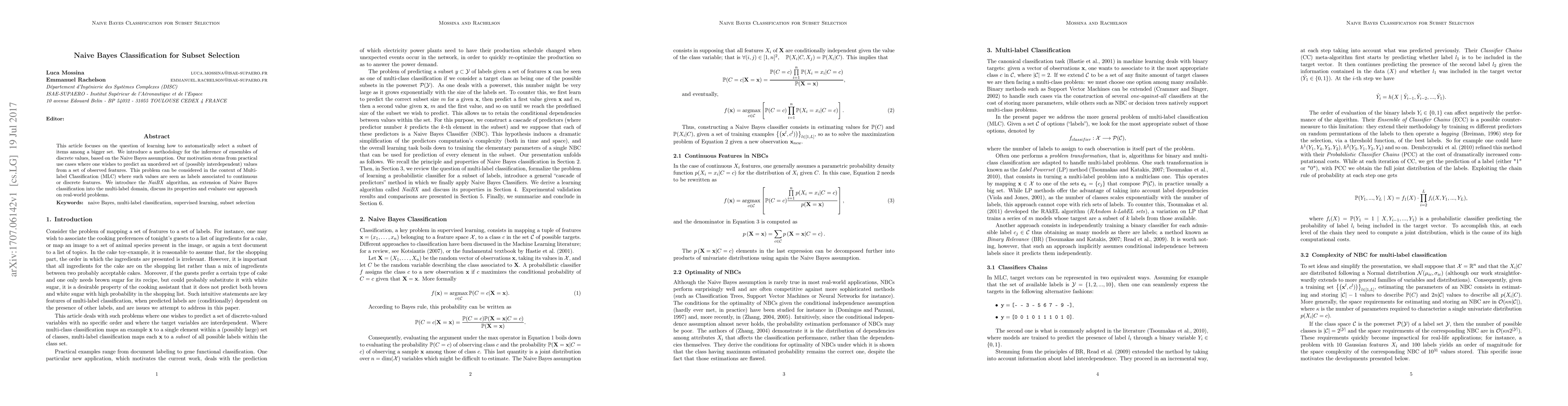 This paper proposes the \nbx algorithm, an extension of Naive Bayes for multi-label classification, to automatically select subsets of items from larger sets. The method is evaluated on real-world problems to demonstrate its effectiveness in predicting unordered sets of interdependent values from observed features.