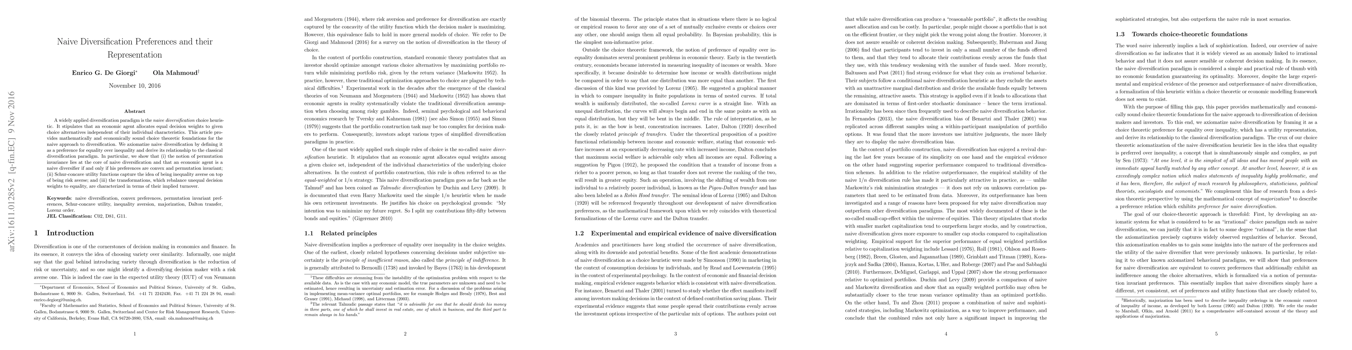 A widely applied diversification paradigm is the naive diversification choice heuristic. It stipulates that an economic agent allocates equal decision weights to given choice alternatives independent of their individual characteristics. This article provides mathematically and economically sound choice theoretic foundations for the naive approach to diversification. We axiomatize naive diversification by defining it as a preference for equality over inequality and derive its relationship to the classical diversification paradigm. In particular, we show that (i) the notion of permutation invariance lies at the core of naive diversification and that an economic agent is a naive diversifier if and only if his preferences are convex and permutation invariant; (ii) Schur-concave utility functions capture the idea of being inequality averse on top of being risk averse; and (iii) the transformations, which rebalance unequal decision weights to equality, are characterized in terms of their implied turnover.