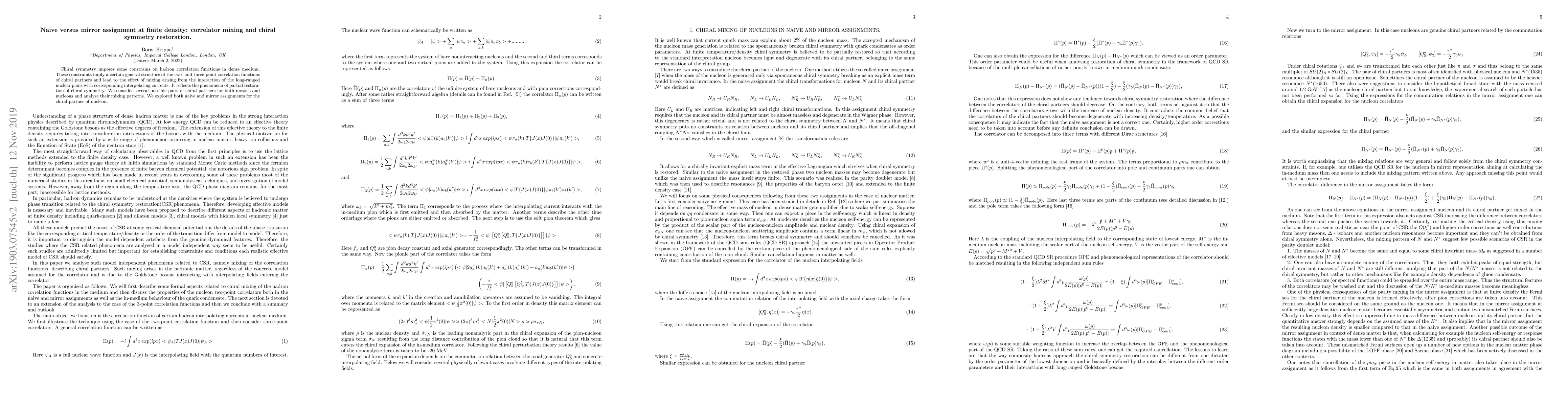 This paper investigates the mixing patterns in hadron correlation functions at finite density, focusing on the effects of chiral symmetry restoration. It compares naive and mirror assignments for nucleon chiral partners, analyzing their implications for the restoration of chiral symmetry and potential phenomenological consequences.