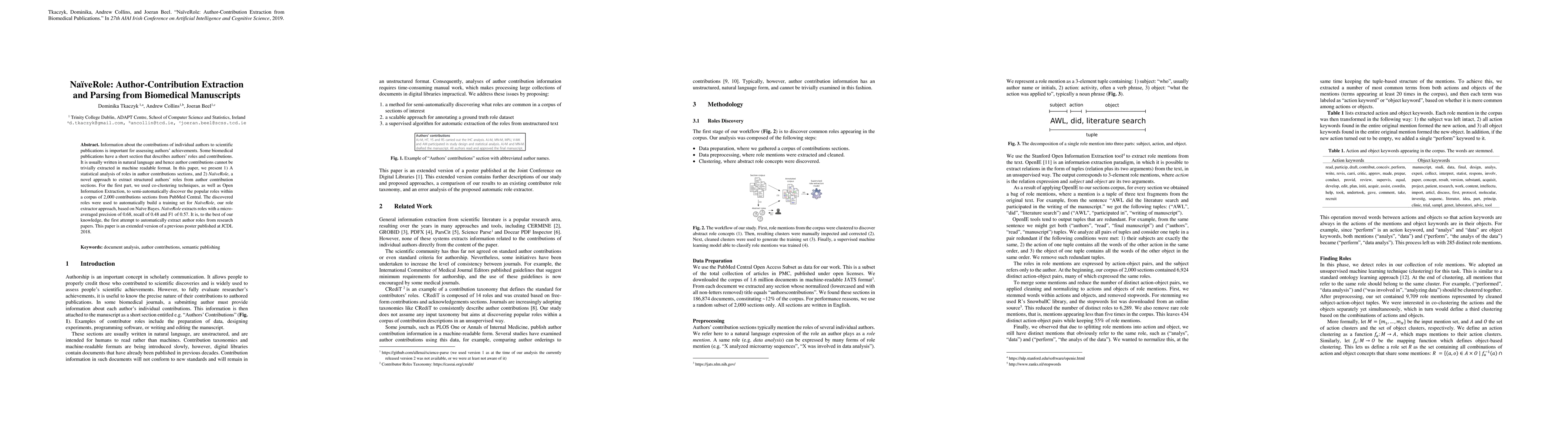 Information about the contributions of individual authors to scientific publications is important for assessing authors' achievements. Some biomedical publications have a short section that describes authors' roles and contributions. It is usually written in natural language and hence author contributions cannot be trivially extracted in a machine-readable format. In this paper, we present 1) A statistical analysis of roles in author contributions sections, and 2) Na\"iveRole, a novel approach to extract structured authors' roles from author contribution sections. For the first part, we used co-clustering techniques, as well as Open Information Extraction, to semi-automatically discover the popular roles within a corpus of 2,000 contributions sections from PubMed Central. The discovered roles were used to automatically build a training set for Na\"iveRole, our role extractor approach, based on Na\"ive Bayes. Na\"iveRole extracts roles with a micro-averaged precision of 0.68, recall of 0.48 and F1 of 0.57. It is, to the best of our knowledge, the first attempt to automatically extract author roles from research papers. This paper is an extended version of a previous poster published at JCDL 2018.