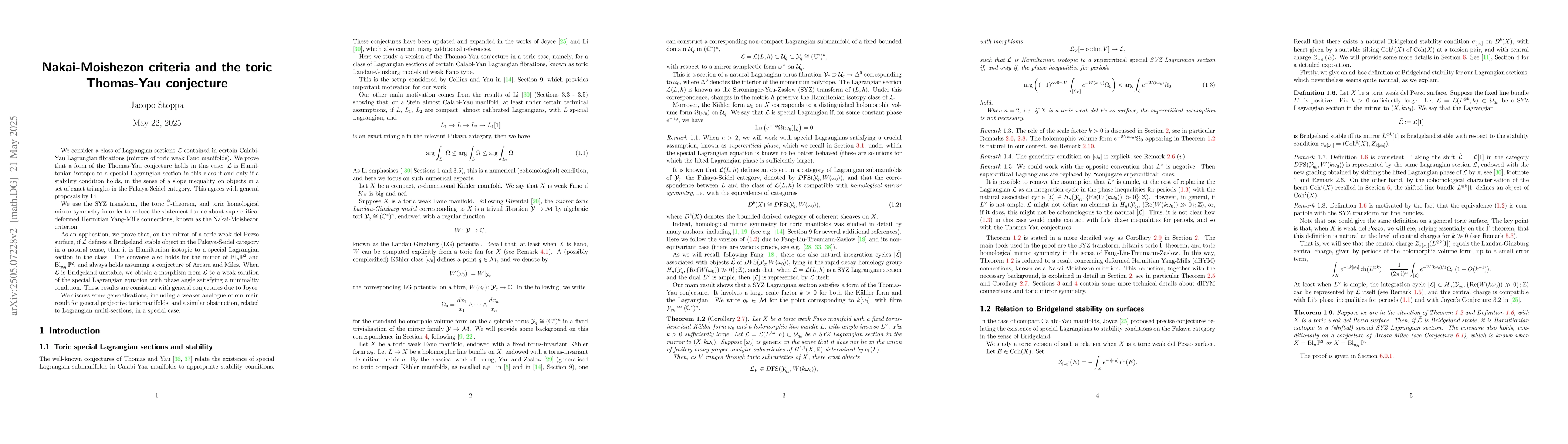 The paper establishes a connection between the Nakai-Moishezon criterion and the toric Thomas-Yau conjecture using advanced tools from symplectic and complex geometry, specifically in the context of Lagrangian sections and Calabi-Yau fibrations.