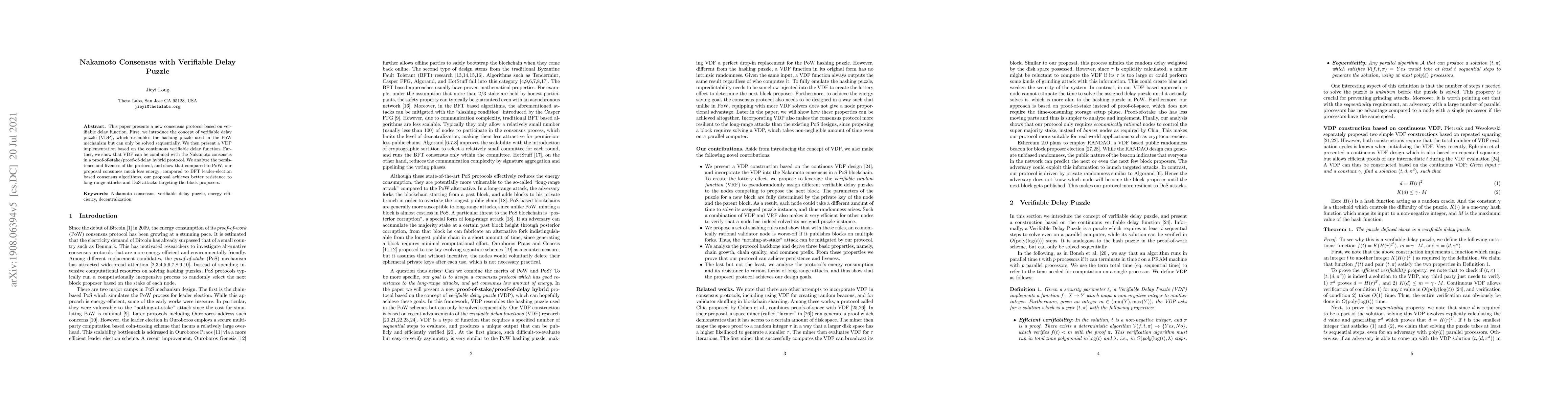 This paper introduces a Nakamoto consensus protocol using verifiable delay puzzles (VDP), which require sequential solving unlike traditional hashing puzzles. The proposed hybrid proof-of-stake/proof-of-delay protocol demonstrates lower energy consumption compared to PoW and better resistance to long-range and DoS attacks compared to BFT leader-election methods.
