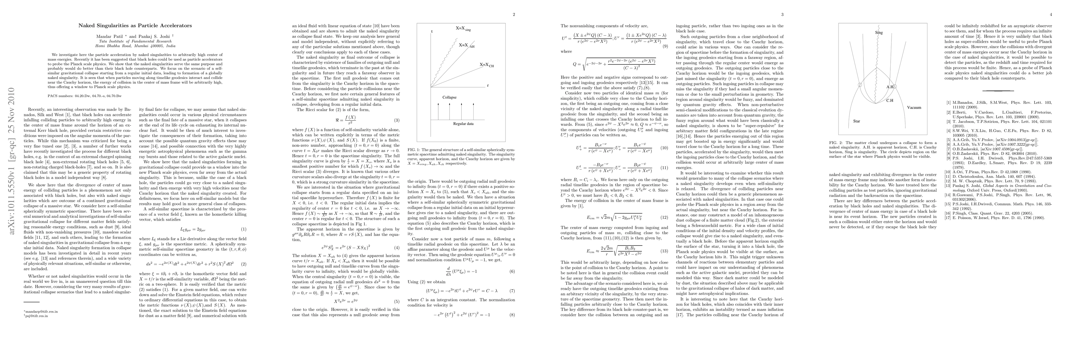We investigate here the particle acceleration by naked singularities to arbitrarily high center of mass energies. Recently it has been suggested that black holes could be used as particle accelerators to probe the Planck scale physics. We show that the naked singularities serve the same purpose and probably would do better than their black hole counterparts. We focus on the scenario of a self-similar gravitational collapse starting from a regular initial data, leading to the formation of a globally naked singularity. It is seen that when particles moving along timelike geodesics interact and collide near the Cauchy horizon, the energy of collision in the center of mass frame will be arbitrarily high, thus offering a window to Planck scale physics.