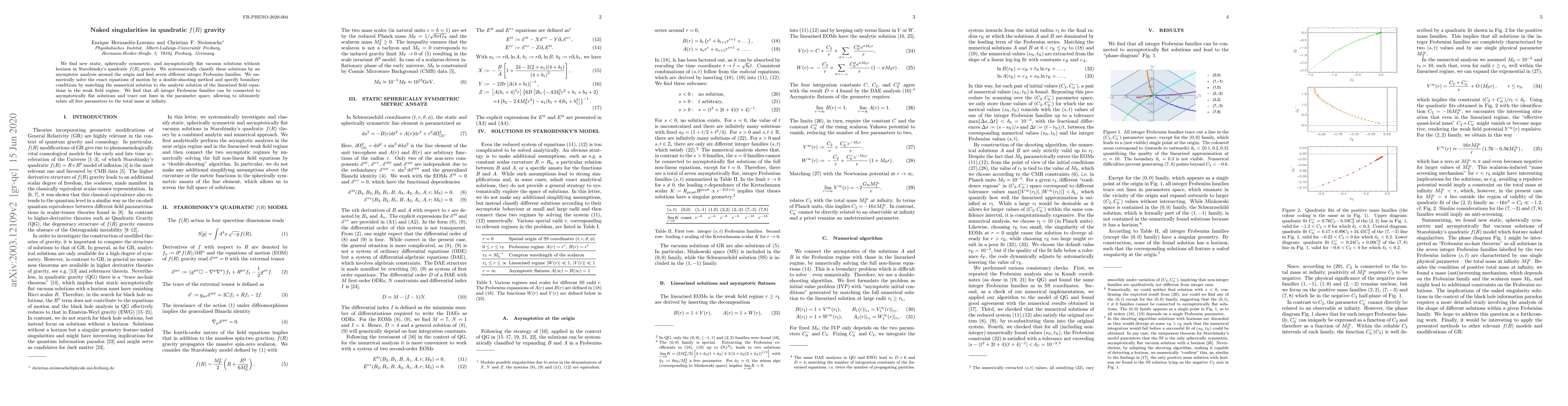 This paper explores new vacuum solutions in quadratic f(R) gravity that lack horizons, termed naked singularities, and classifies them into seven distinct Frobenius families. The authors connect these families to asymptotically flat solutions and relate all free parameters to the total mass at infinity.