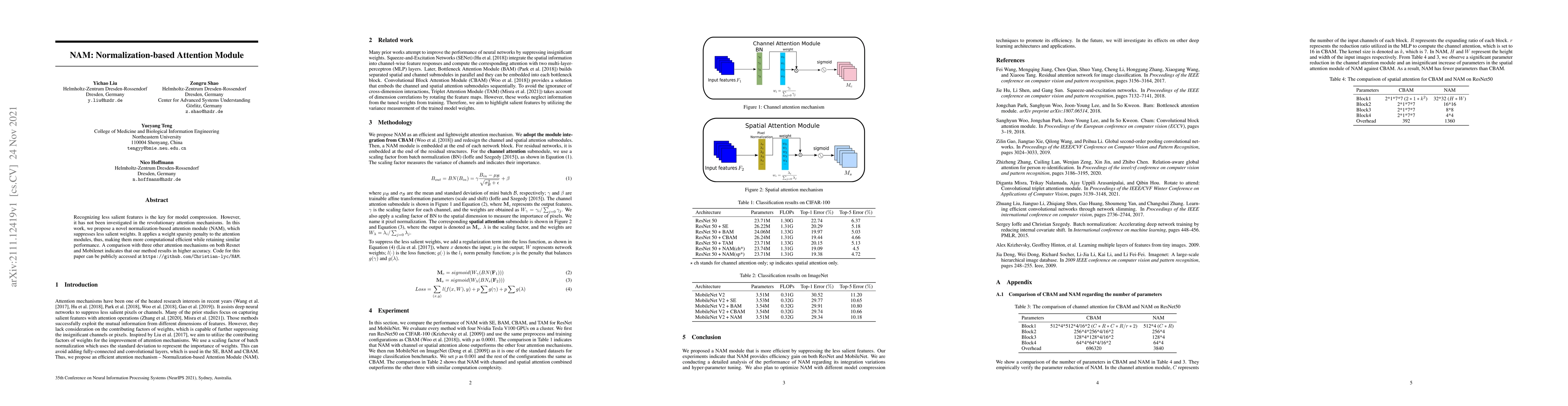 A new attention module called NAM is proposed to improve model compression by suppressing less salient features without sacrificing accuracy. It outperforms other attention mechanisms in Resnet and Mobilenet models.