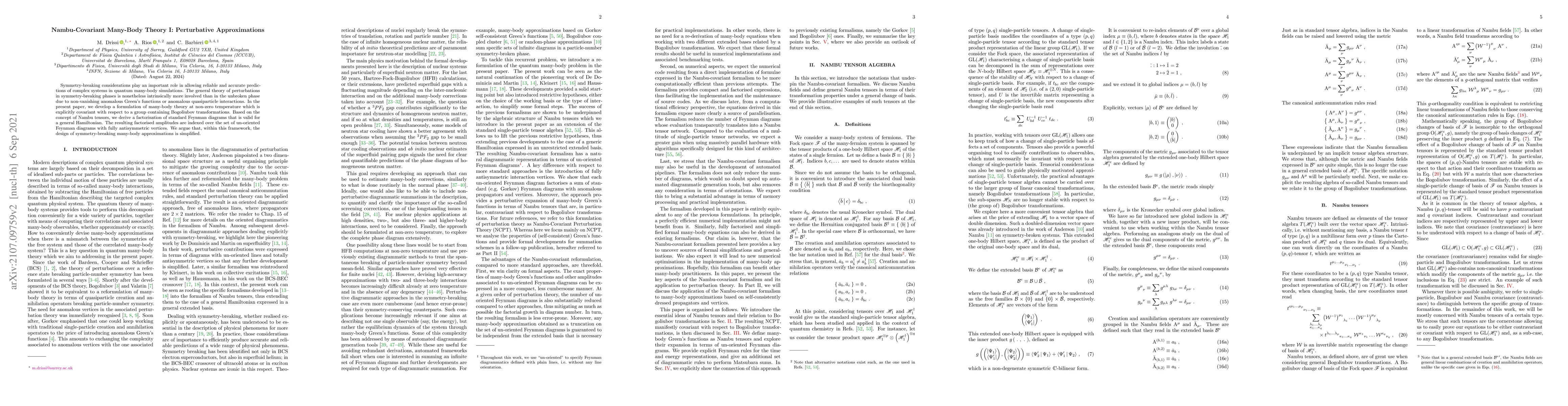 This paper develops a Nambu-covariant many-body theory for perturbative approximations in symmetry-breaking phases, utilizing Nambu tensors to factorize Feynman diagrams. The approach simplifies the design of many-body approximations by leveraging non-vanishing anomalous terms.