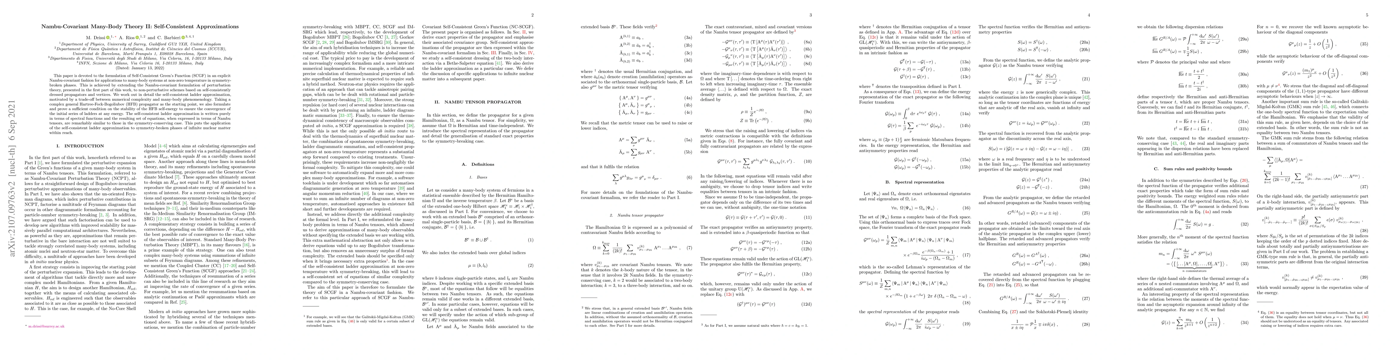 This paper is devoted to the formulation of Self-Consistent Green's Function (SCGF) in an explicit Nambu-covariant fashion for applications to many-body systems at non-zero temperature in symmetry-broken phases. This is achieved by extending the Nambu-covariant formulation of perturbation theory, presented in the first part of this work, to non-perturbative schemes based on self-consistently dressed propagators and vertices. We work out in detail the self-consistent ladder approximation, motivated by a trade-off between numerical complexity and many-body phenomenology. Taking a complex general Hartree-Fock-Bogoliubov (HFB) propagator as the starting point, we also formulate and prove a sufficient condition on the stability of the HFB self-energy to ensure the convergence of the initial series of ladders at any energy. The self-consistent ladder approximation is written purely in terms of spectral functions and the resulting set of equations, when expressed in terms of Nambu tensors, are remarkably similar to those in the symmetry-conserving case. This puts the application of the self-consistent ladder approximation to symmetry-broken phases of infinite nuclear matter within reach.