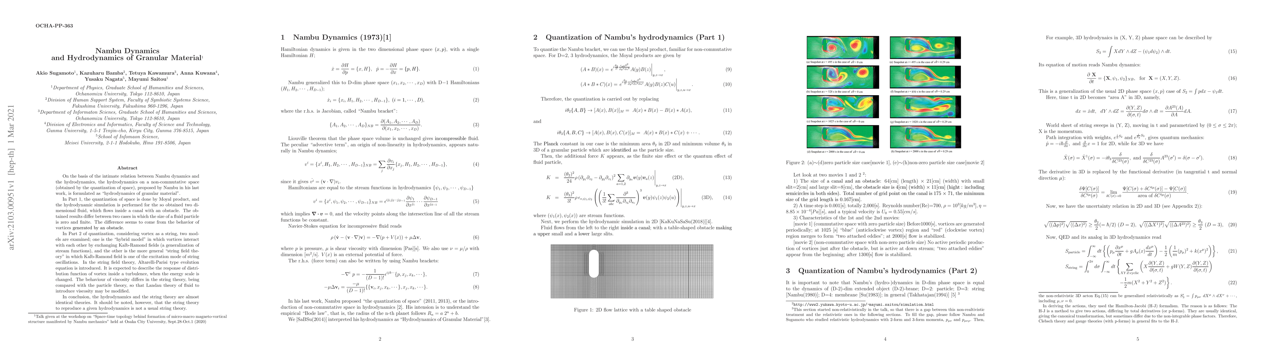 On the basis of the intimate relation between Nambu dynamics and the hydrodynamics, the hydrodynamics on a non-commutative space (obtained by the quantization of space), proposed by Nambu in his last work, is formulated as ``hydrodynamics of granular material''. In Part 1, the quantization of space is done by Moyal product, and the hydrodynamic simulation is performed for the so obtained two dimensional fluid, which flows inside a canal with an obstacle. The obtained results differ between two cases in which the size of a fluid particle is zero and finite. The difference seems to come from the behavior of vortices generated by an obstacle. In Part 2 of quantization, considering vortex as a string, two models are examined; one is the ``hybrid model'' in which vortices interact with each other by exchanging Kalb-Ramond fields (a generalization of stream functions), and the other is the more general ``string field theory'' in which Kalb-Ramond field is one of the excitation mode of string oscillations. In the string field theory, Altarelli-Parisi type evolution equation is introduced. It is expected to describe the response of distribution function of vortex inside a turbulence, when the energy scale is changed. The behaviour of viscosity differs in the string theory, being compared with the particle theory, so that Landau theory of fluid to introduce viscosity may be modified. In conclusion, the hydrodynamics and the string theory are almost identical theories. It should be noted, however, that the string theory to reproduce a given hydrodynamics is not a usual string theory.