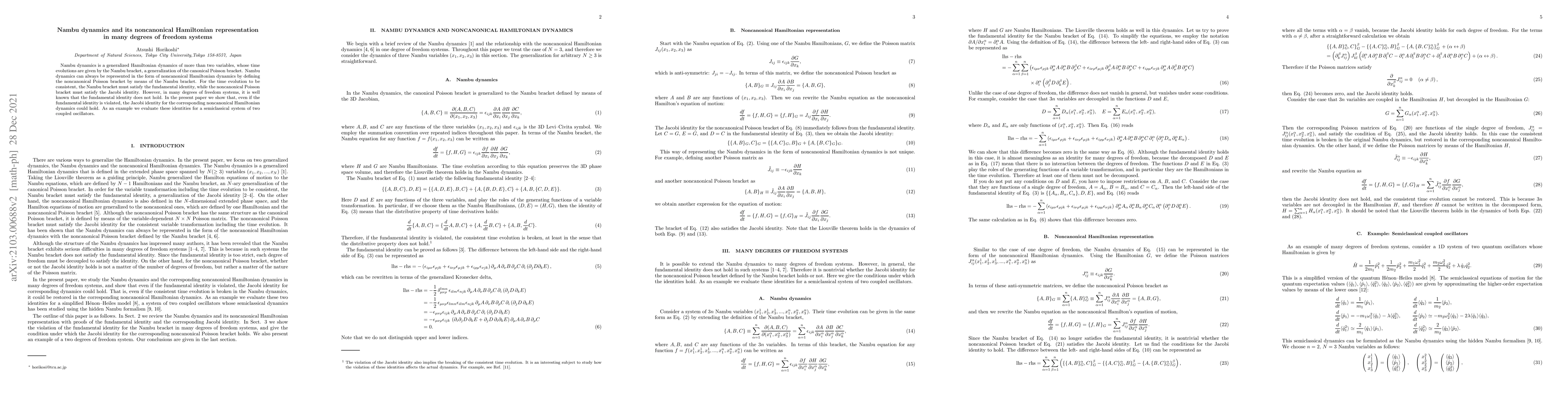 This paper explores the representation of Nambu dynamics in many degrees of freedom systems using noncanonical Hamiltonian dynamics. It demonstrates that while the fundamental identity may be violated, the Jacobi identity can still hold, as illustrated through a semiclassical system of two coupled oscillators.