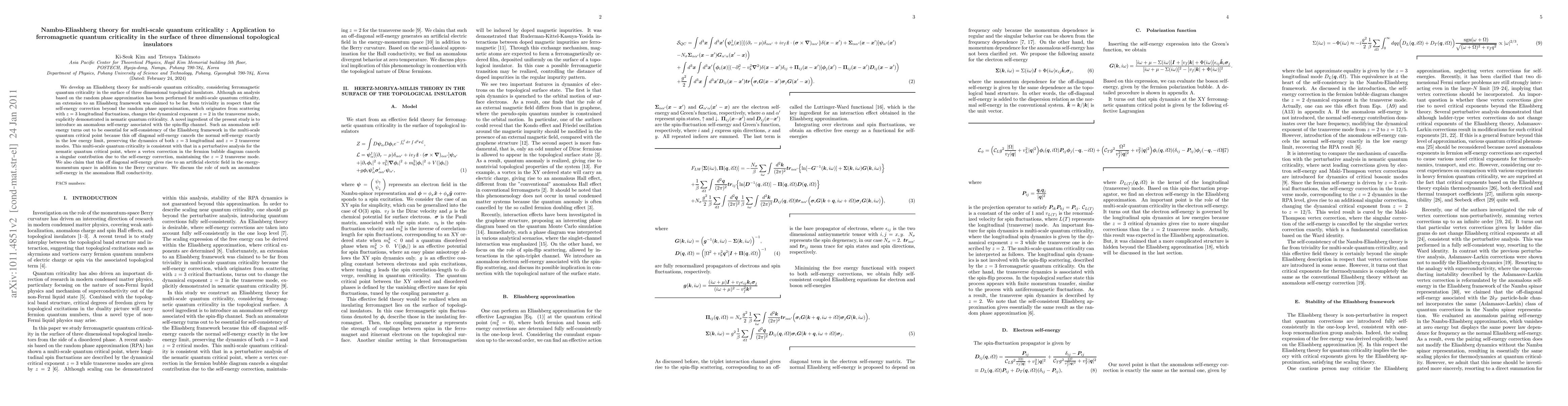 We develop an Eliashberg theory for multi-scale quantum criticality, considering ferromagnetic quantum criticality in the surface of three dimensional topological insulators. Although an analysis based on the random phase approximation has been performed for multi-scale quantum criticality, an extension to an Eliashberg framework was claimed to be far from triviality in respect that the self-energy correction beyond the random phase approximation, which originates from scattering with $z = 3$ longitudinal fluctuations, changes the dynamical exponent $z = 2$ in the transverse mode, explicitly demonstrated in nematic quantum criticality. A novel ingredient of the present study is to introduce an anomalous self-energy associated with the spin-flip channel. Such an anomalous self-energy turns out to be essential for self-consistency of the Eliashberg framework in the multi-scale quantum critical point because this off diagonal self-energy cancels the normal self-energy exactly in the low energy limit, preserving the dynamics of both $z = 3$ longitudinal and $z = 2$ transverse modes. This multi-scale quantum criticality is consistent with that in a perturbative analysis for the nematic quantum critical point, where a vertex correction in the fermion bubble diagram cancels a singular contribution due to the self-energy correction, maintaining the $z = 2$ transverse mode. We also claim that this off diagonal self-energy gives rise to an artificial electric field in the energy-momentum space in addition to the Berry curvature. We discuss the role of such an anomalous self-energy in the anomalous Hall conductivity.