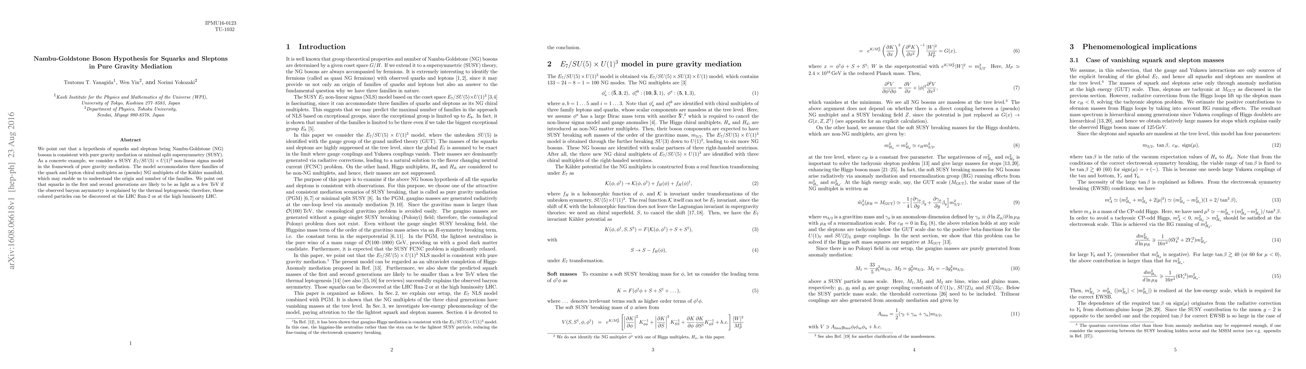 We point out that a hypothesis of squarks and sleptons being Nambu-Goldstone (NG) bosons is consistent with pure gravity mediation or minimal split supersymmetry (SUSY). As a concrete example, we consider a SUSY $E_7/SU(5) \times U(1)^3$ non-linear sigma model in the framework of pure gravity mediation. The model accommodates three families of the quark and lepton chiral multiplets as (pseudo) NG multiplets of the Kahler manifold, which may enable us to understand the origin and number of the families. We point out that squarks in the first and second generations are likely to be as light as a few TeV if the observed baryon asymmetry is explained by the thermal leptogenesis; therefore, these colored particles can be discovered at the LHC Run-2 or at the high luminosity LHC.